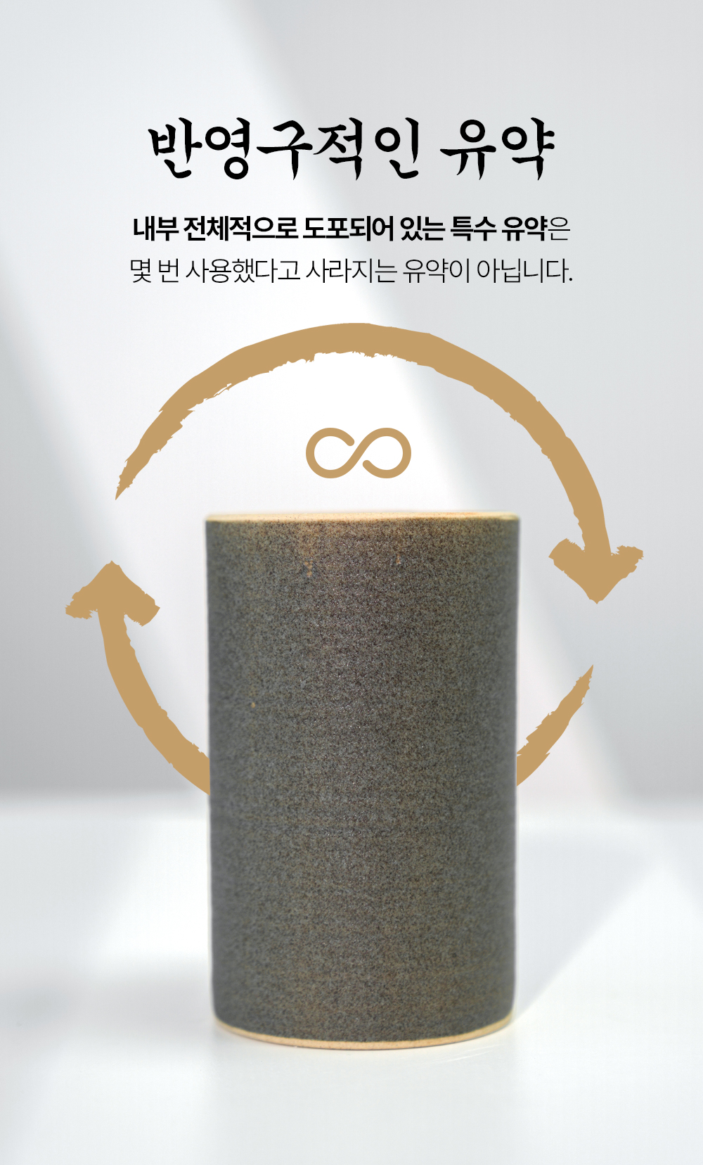 내부에 고르게 도포된 특수 유약은 반영구적으로 그 효과를 발휘하며, 물의 기포를 작게 쪼개는 역할을 합니다. 이 유약 덕분에 물은 부드럽고 청량한 맛을 유지하며, 마실 때마다 목 넘김이 한층 더 편안해집니다.
