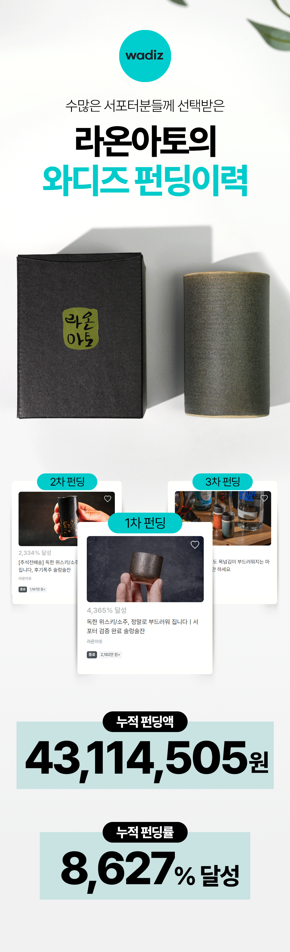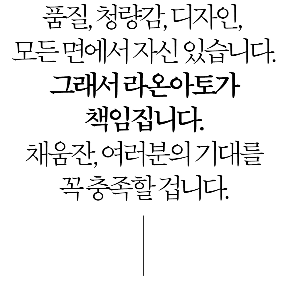 채움잔의 매력을 서포터님께 꼭 소개해 주고 싶어서 와디즈에서 국내 출시를 하게 되었습니다. 와디즈에서 술렁 술잔으로 처음 펀딩을 시작하였고, 지금의 라온 아토가 있게끔 응원해 주신 서포터님께 감사의 마음을 담았습니다.