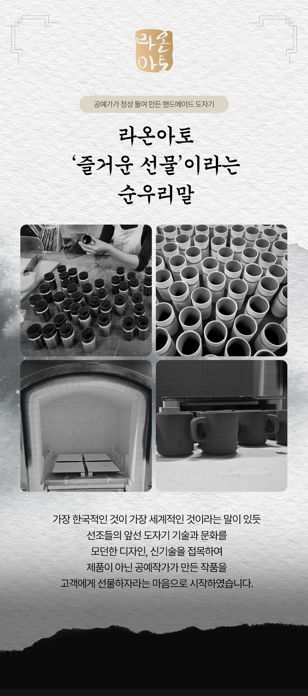 앞선 도자기 기술과 문화를 모던한 디자인, 신기술을 접목하여 제품이 아닌 공예작가가 만든 작품을 고객에게 선물하자라는 마음으로 시작하였습니다.