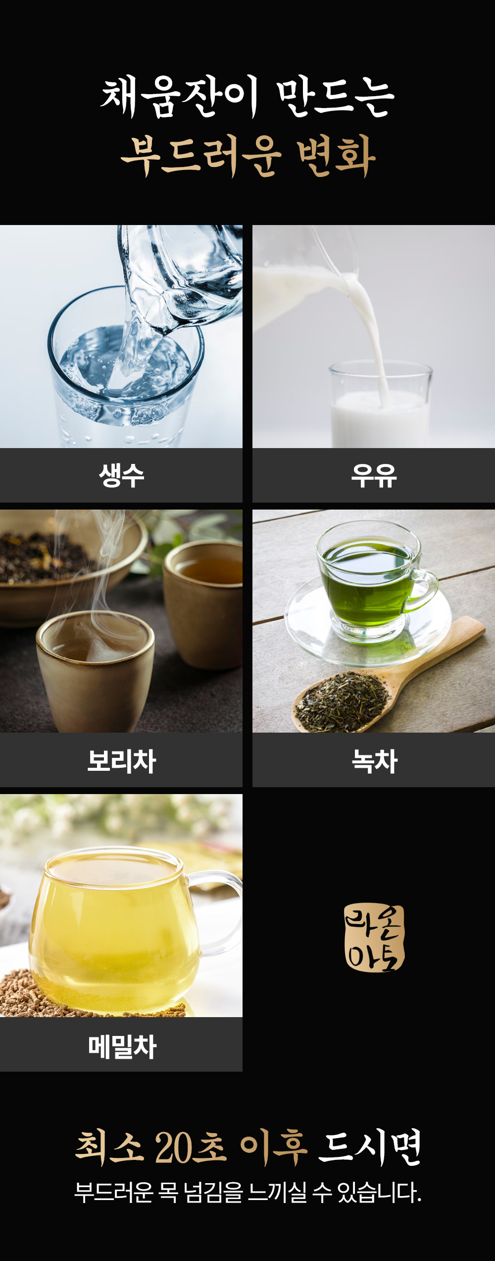 채움잔은 단순히 물만을 위한 잔이 아닙니다. 물은 물론, 우유,다양한 차(메밀차,녹차 등)까지 채움잔과 함께라면 더 부드럽고 신선하게 즐길 수 있습니다. (술, 탄산이 들어간 음료, 커피 등은 권장하지 않습니다. 본연의 맛보다 밋밋해집니다.)