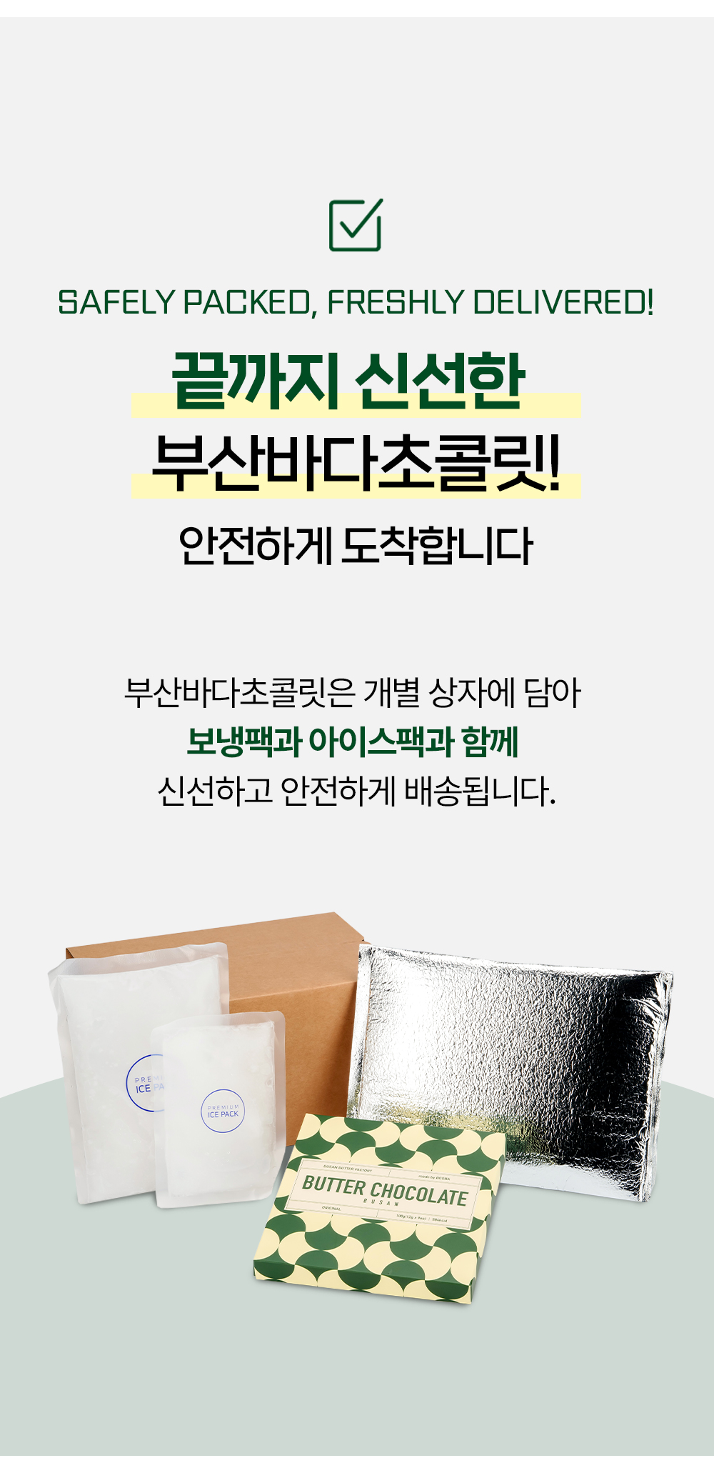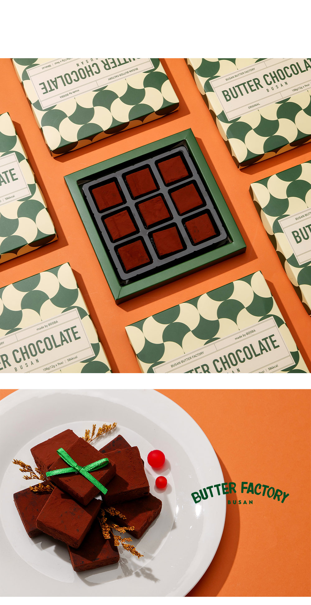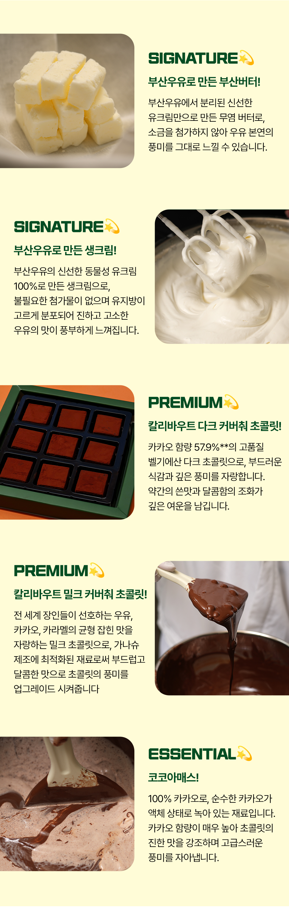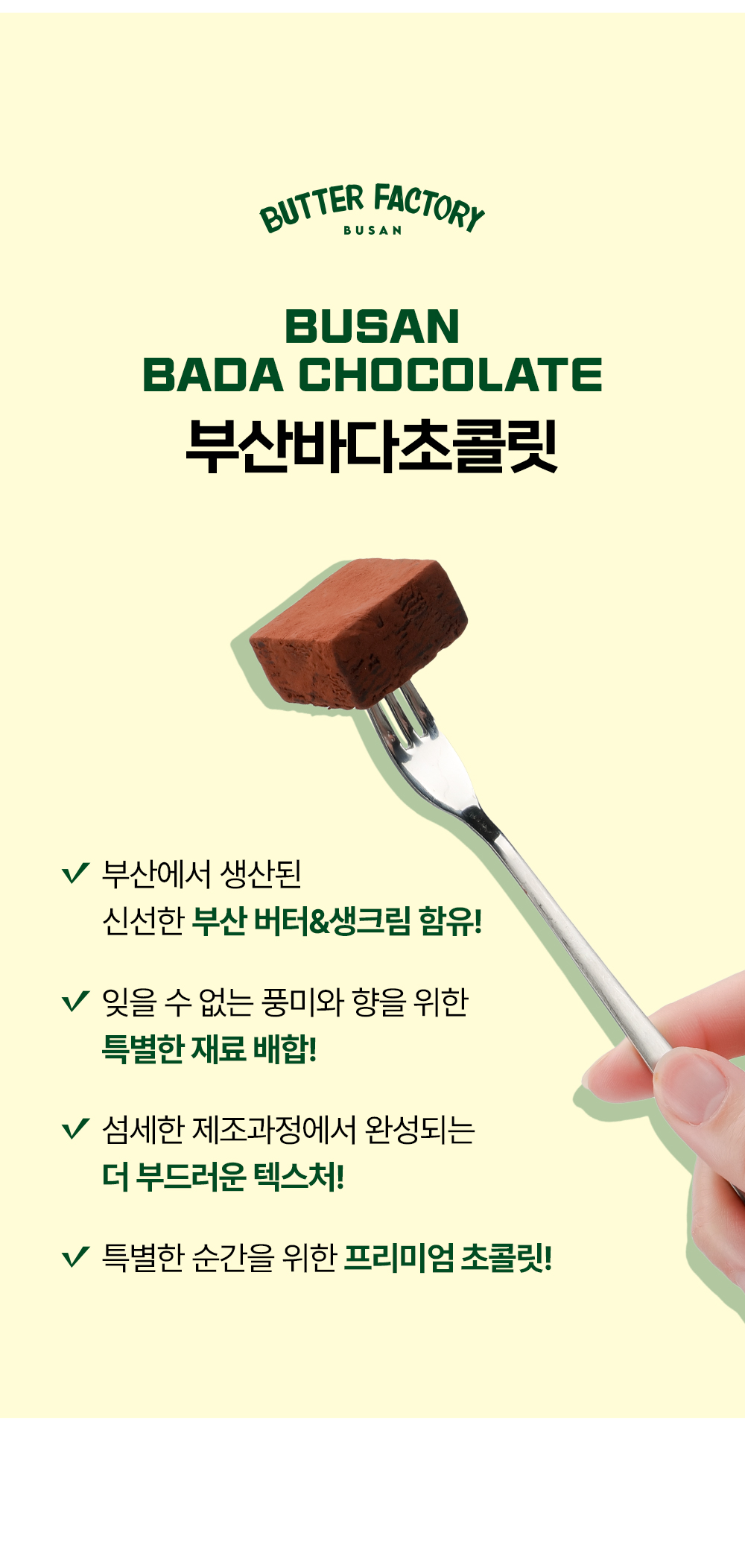 A. 부산우유로 만든 신선한 버터는 초콜릿의 고소한 풍미를 한층 더 돋보이게 하며, 더욱 부드러운 식감을 제공합니다.