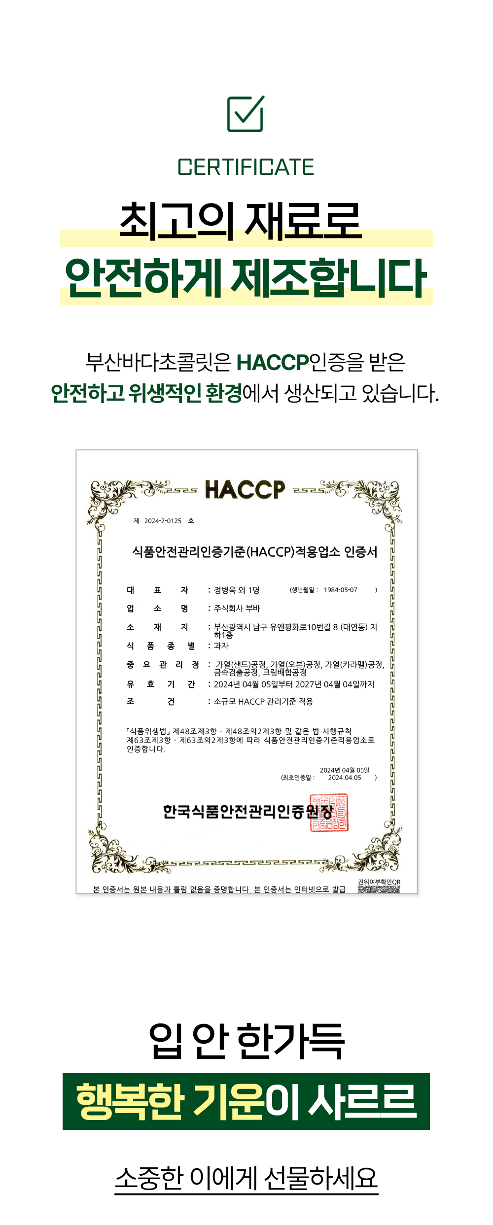 A. HACCP 인증을 받은 ㈜부바의 시설에서 안전하게 생산됩니다.