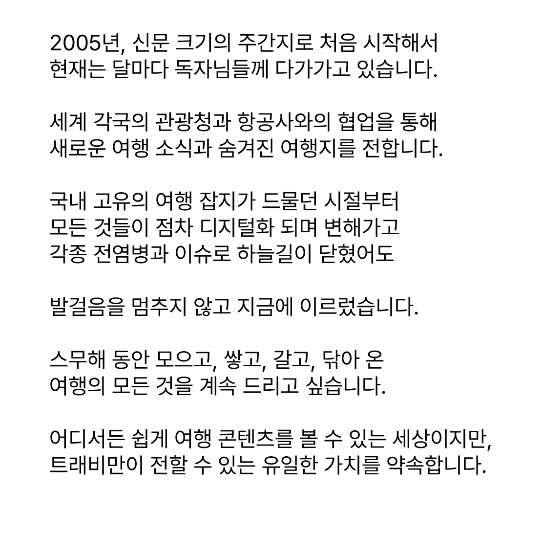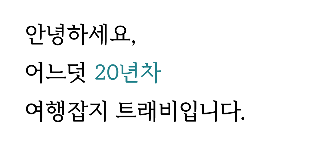 잡지 시장은 지금 많이 어려운데요. 여행 업계도 그렇습니다. 그 사이에 있는 트래비도 쉽지 않은 길을 가고 있습니다. 해외 라이선스 여행 잡지가 많이 사라지고 있는 추세임에도 한국 사람이 만든, 한국 고유의 여행잡지 트래비는 20년간 어려운 시기마다 구독자님이 있었기에 잘 헤쳐올 수 있었습니다.