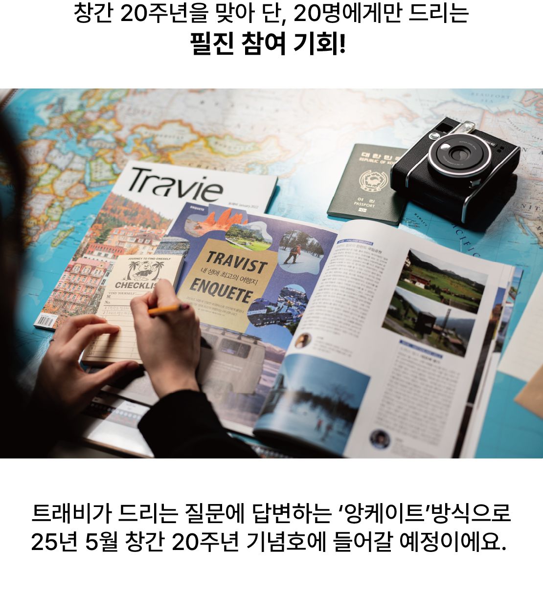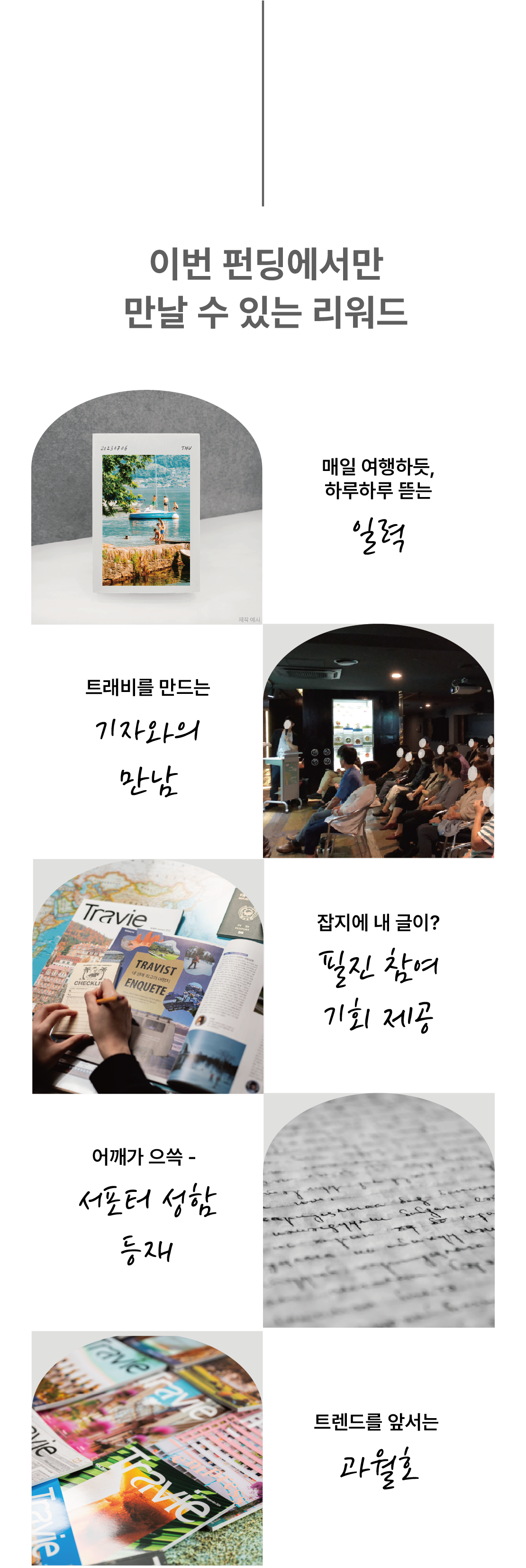 숨은 여행지를 발굴하는 20년 차 여행잡지 〈트래비〉. 창간 20주년, 두 번 다시 없을 혜택만을 모아 와디즈 서포터님께 선보입니다. 아무도 가지 않은 곳으로 먼저 떠나 보세요.