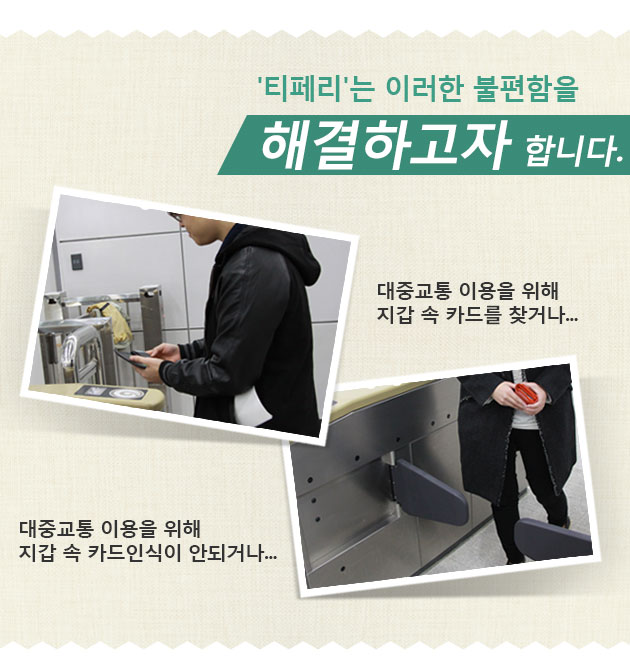 지하철을 타고 다니면서 교통카드를 찾기 위해 지갑, 가방을 뒤지시거나 조깅같은 운동을 하시면서 두툼한 지갑을 갖고 다니시는걸 보면서 저걸 개선할 수 없을까? 라는 고민을 거듭한 끝에 '티페리'라는 상품을 만들게 되었습니다.