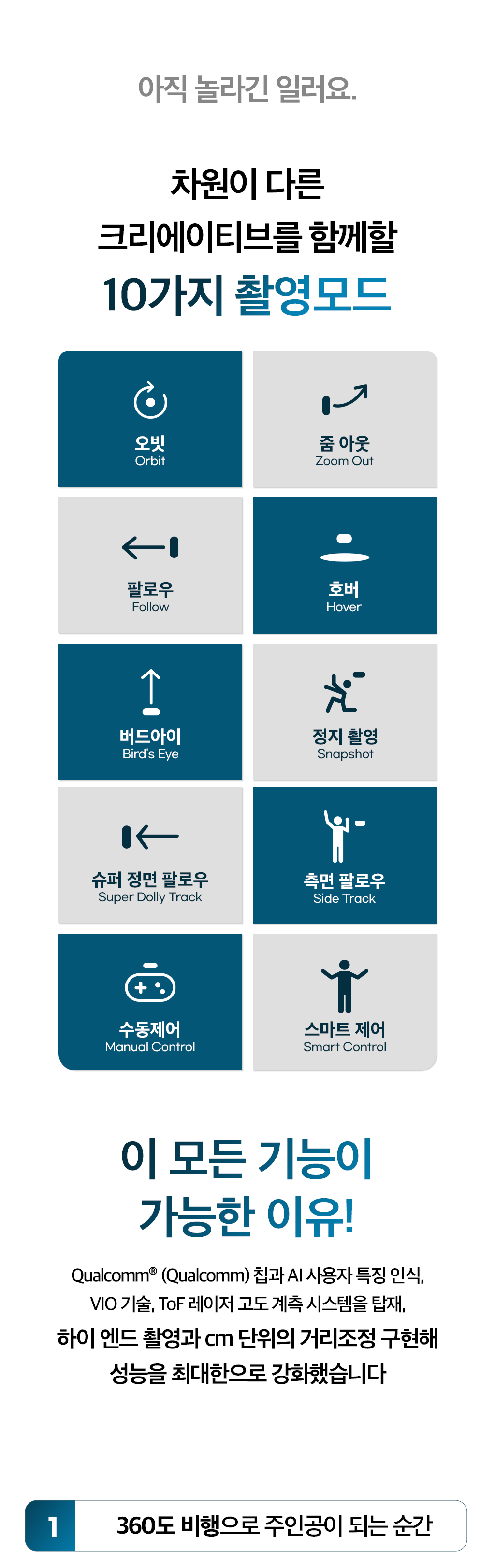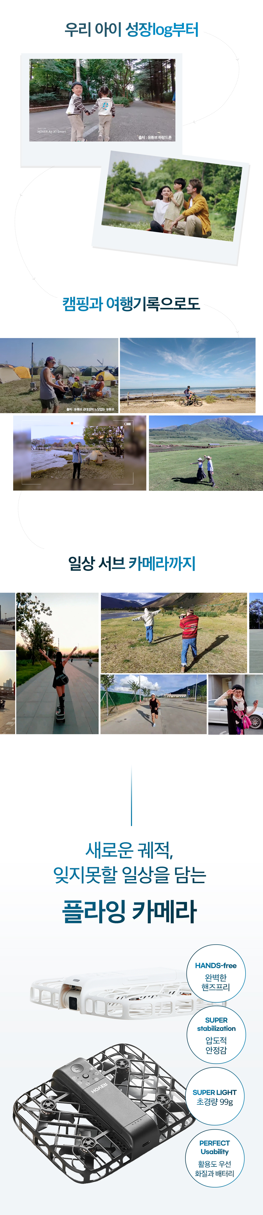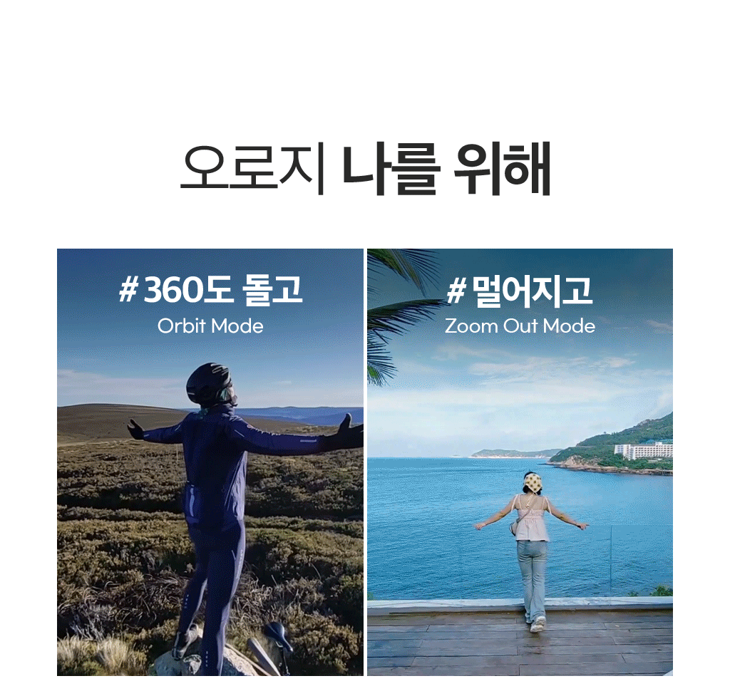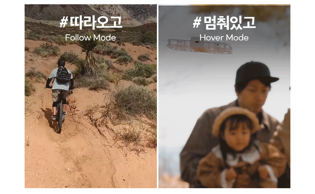 내가 사랑하는 모든 이들과 나를 위한 가장 완벽한 플라잉 카메라. 언제 어디서든 우리의 순간을 팔로우하며 기록해줄거에요. 10가지 AI 자율 촬영 모드로 손쓰지 않아도 알아서 찰칵