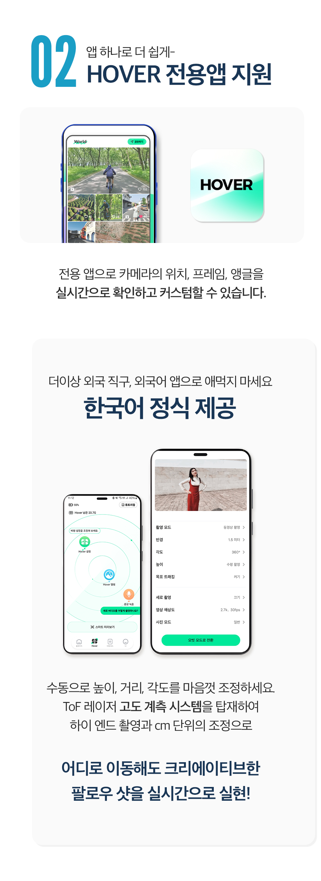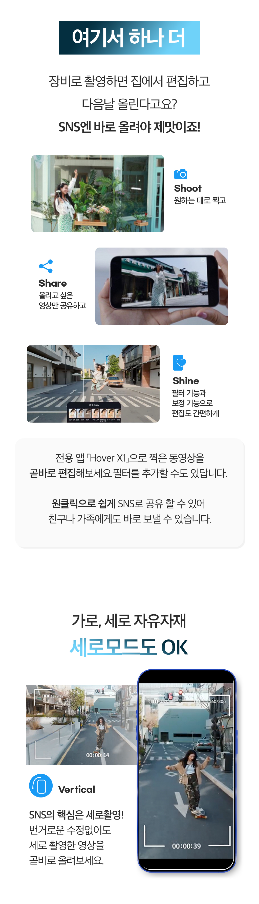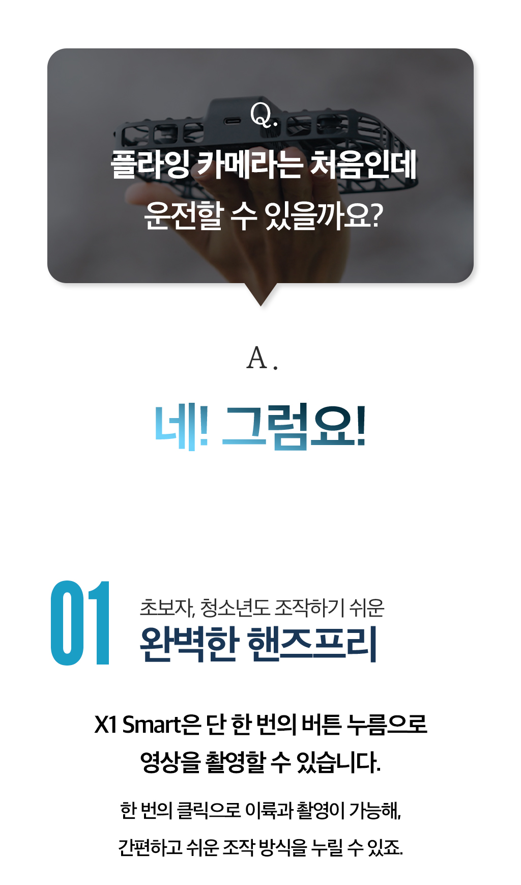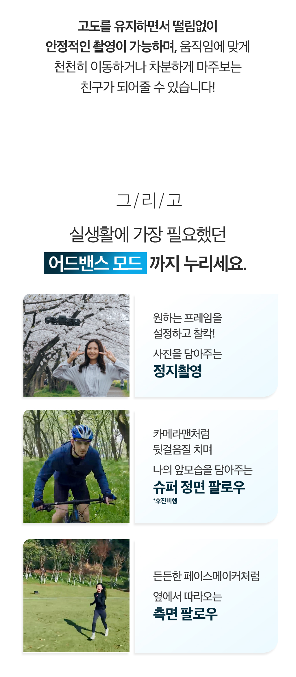 내가 사랑하는 모든 이들과 나를 위한 가장 완벽한 플라잉 카메라. 언제 어디서든 우리의 순간을 팔로우하며 기록해줄거에요. 10가지 AI 자율 촬영 모드로 손쓰지 않아도 알아서 찰칵