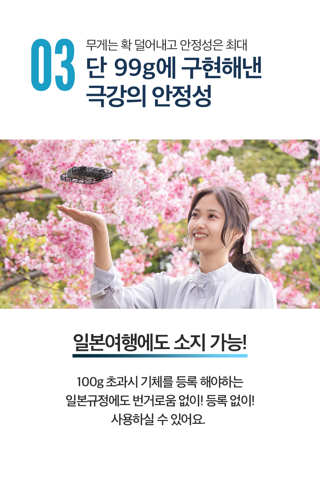 저희 제품의 중량은 99g 으로 별도의 드론 신고 해당사항이 없는 제품입니다. 펀딩에 참고해주세요 :)