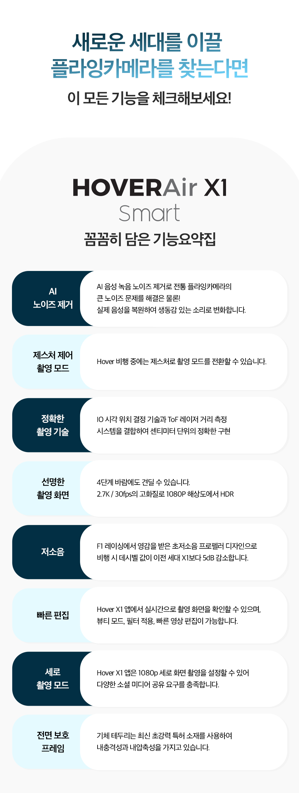 140여개가 넘는 특허를 바탕으로 2016년 첫 제품인 Hover Camera Passport를 출시한 이래 2023년 HOVERAir X1, 2024년 HOVERAir X1 Smart 까지, 끝임없는 기술 개발과 사용자 중심의 제품을 출시하고 있습니다.
