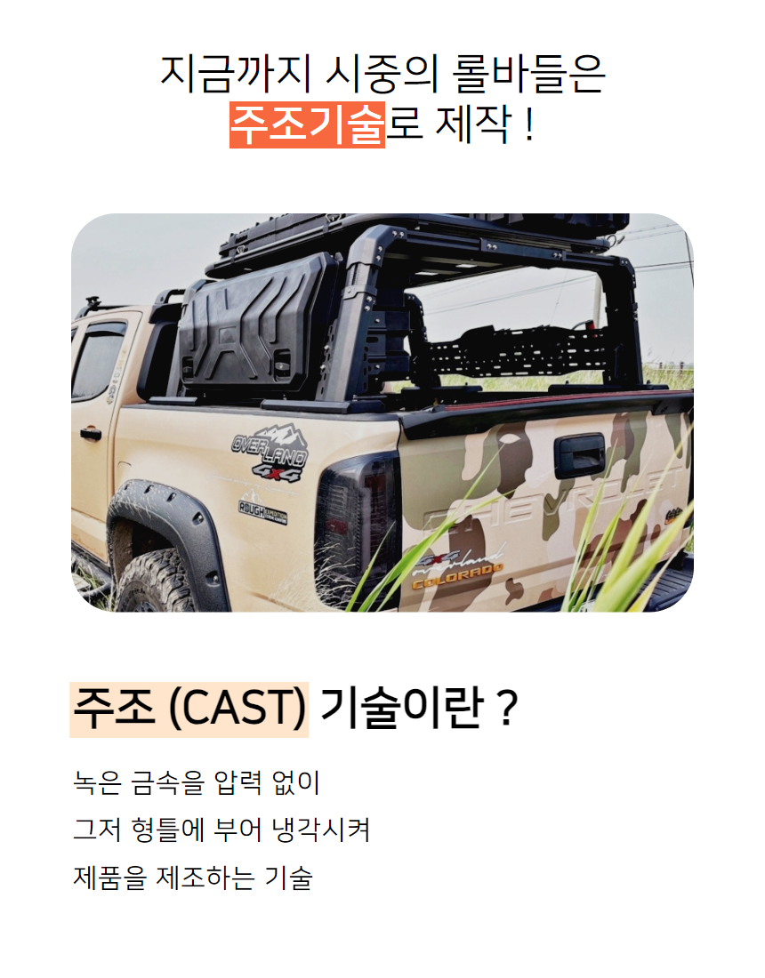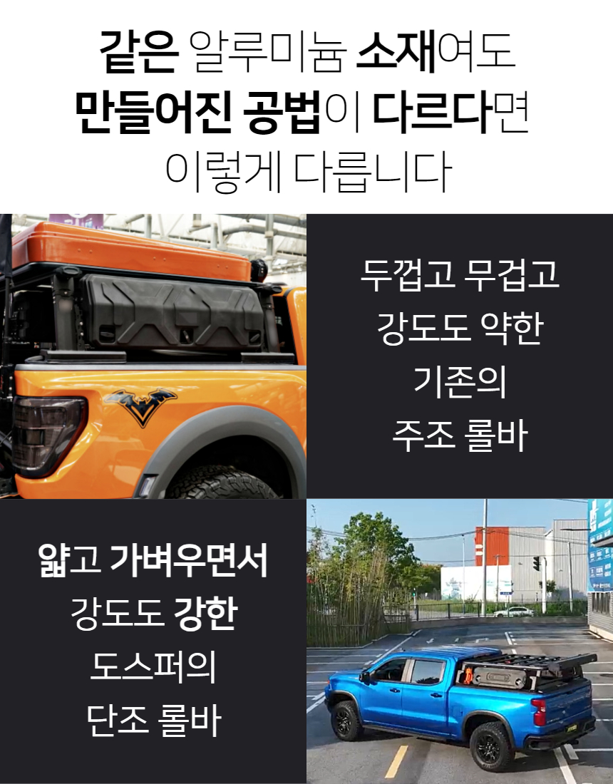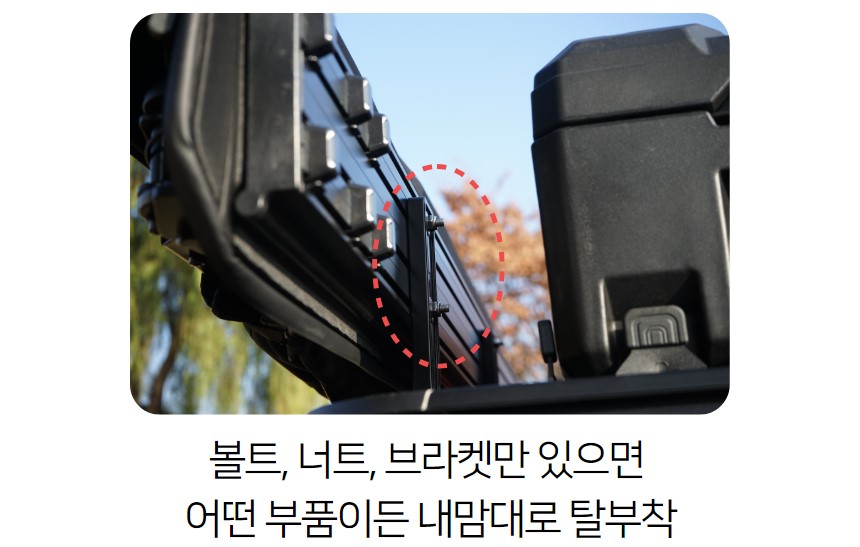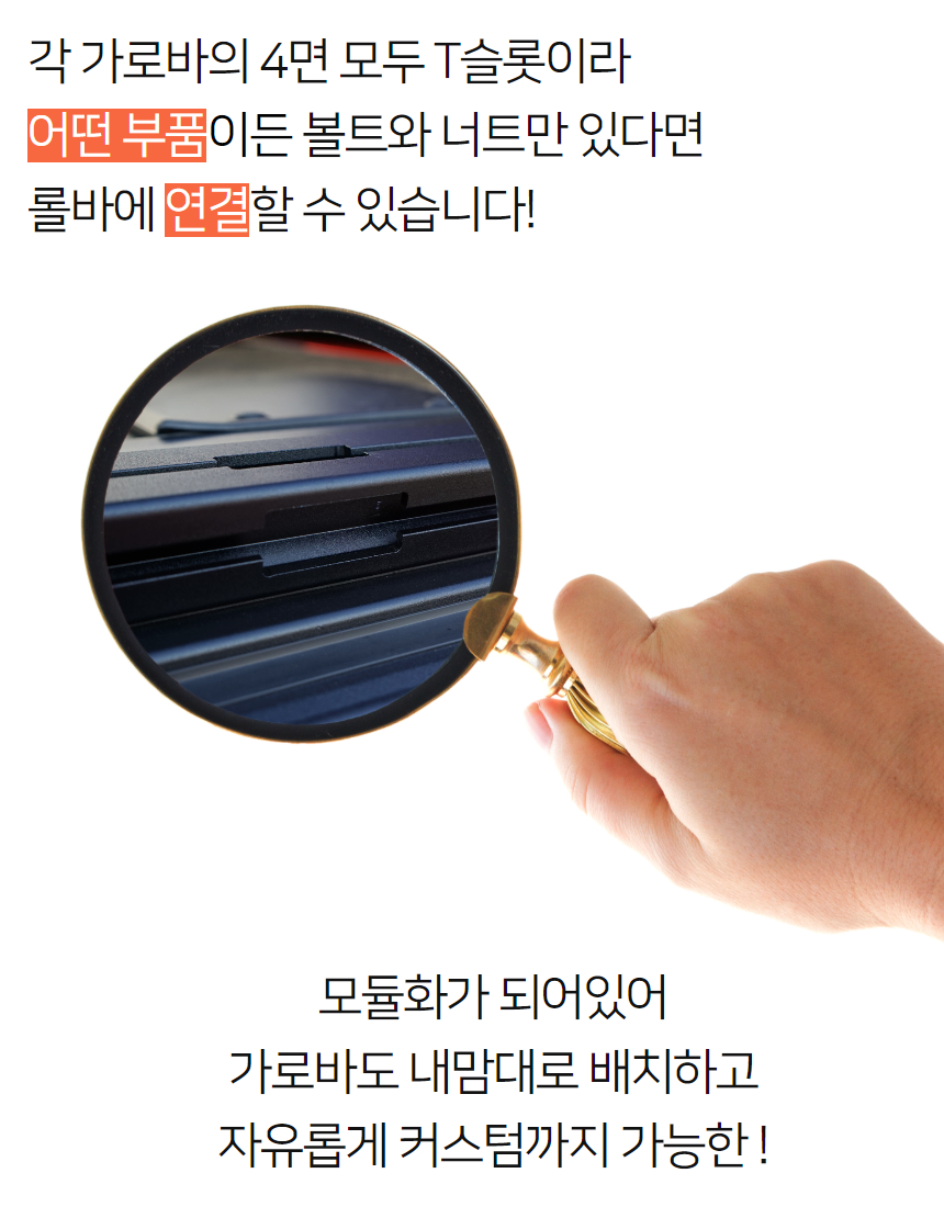 단조공법으로 만들어져 밀도가 높고 단단하지만 가벼운 알루미늄 롤바입니다. 롤바의 4면에 T슬롯이 장착되어있어 어떤 부품이든 볼트와 너트로 장착이 가능합니다. 부식과 변형이 없습니다