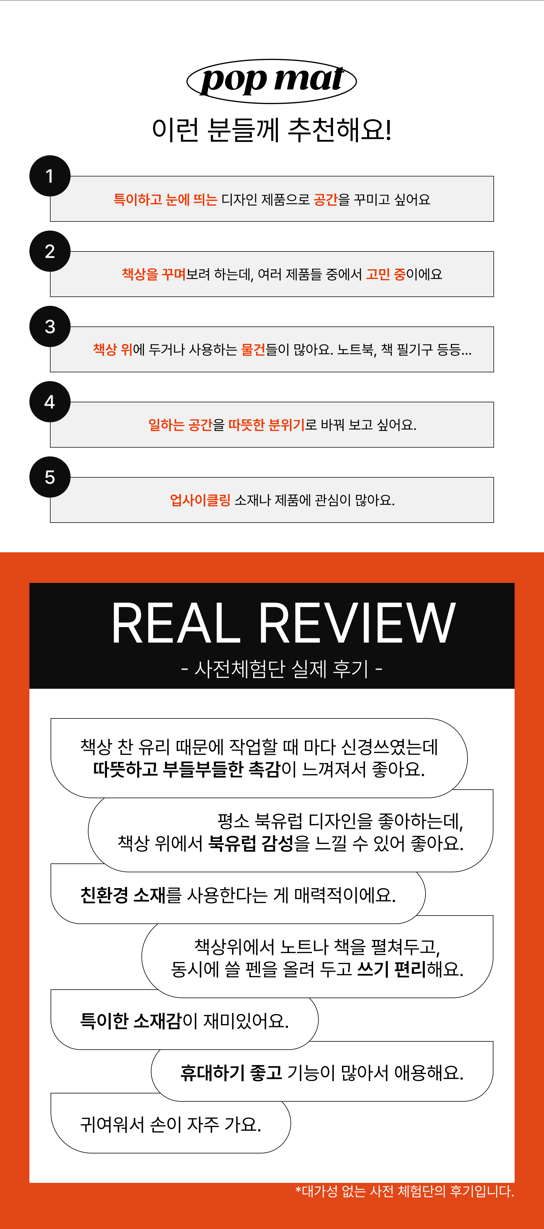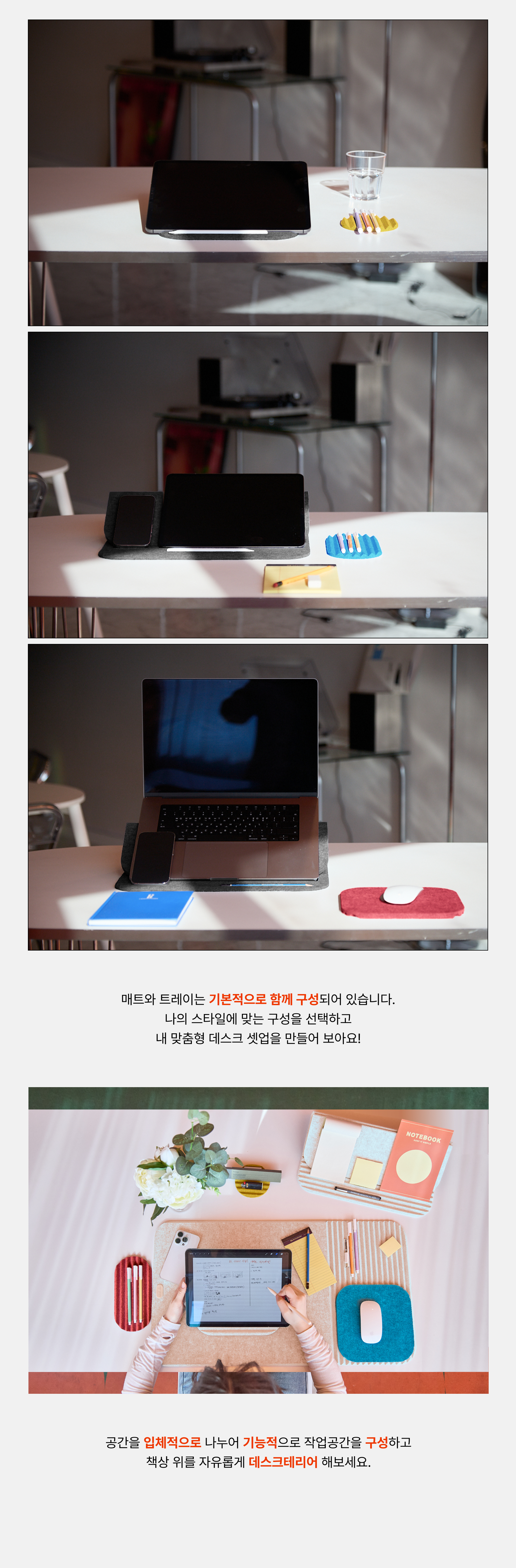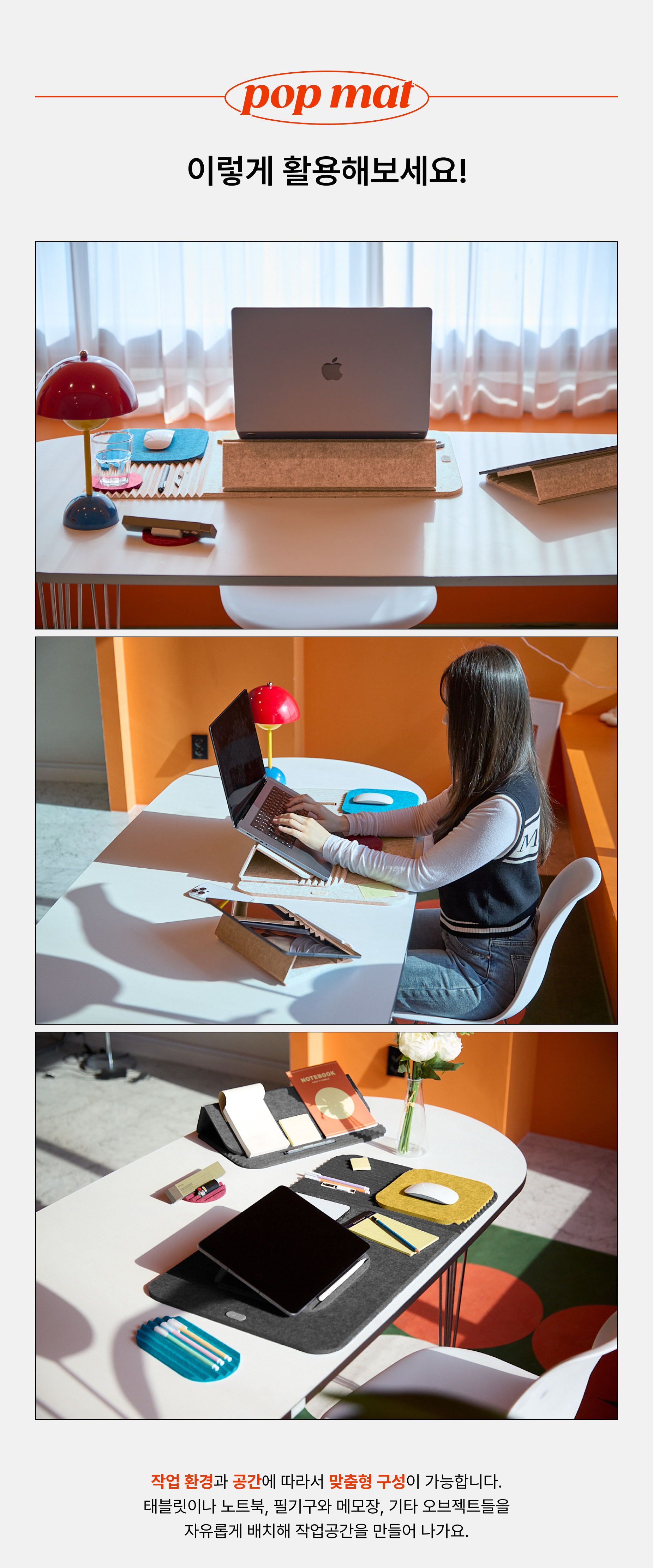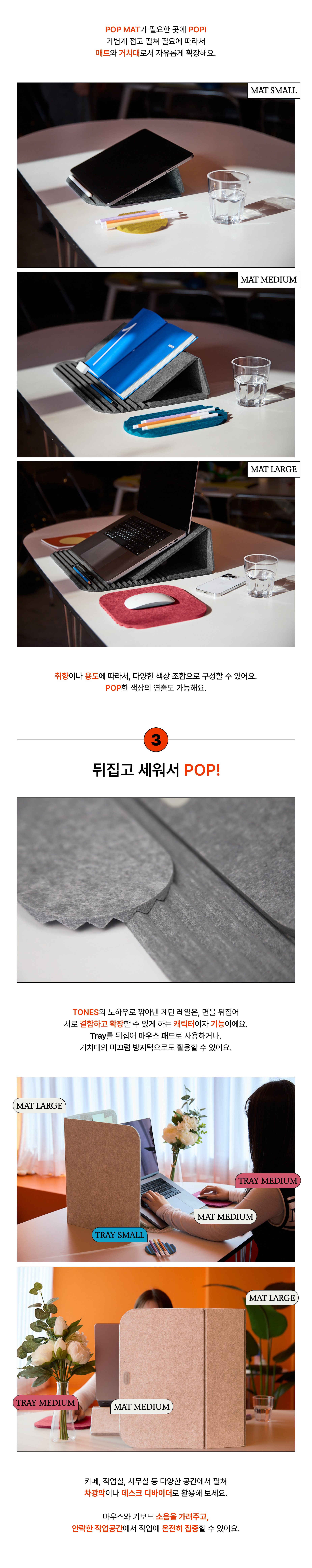 데스크 매트부터 거치대, 디바이더로도 활용 가능한 톤즈 팝매트로 어디서든 나만의 작업 환경을 만들어 보세요. 간단한 조합으로도 북유럽 감성 데스크 셋업을 손쉽 경험할 수 있어요.