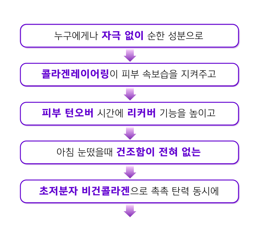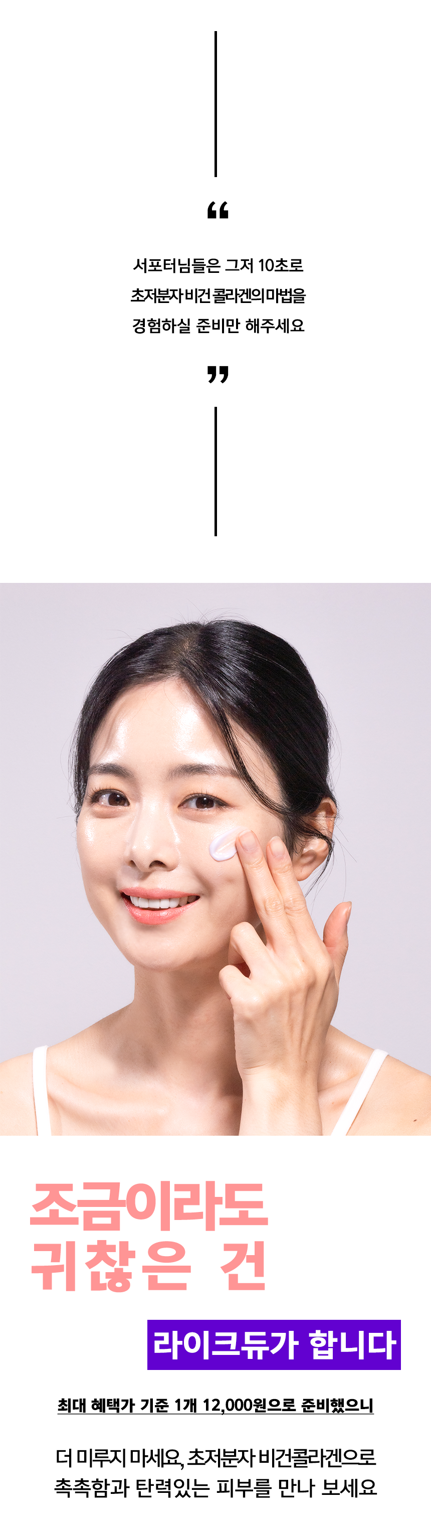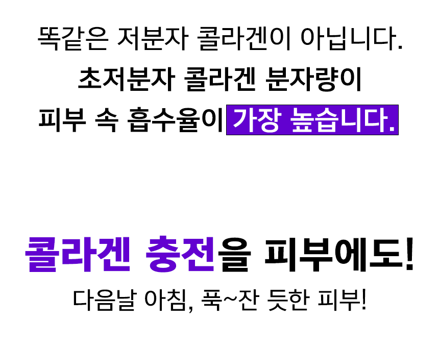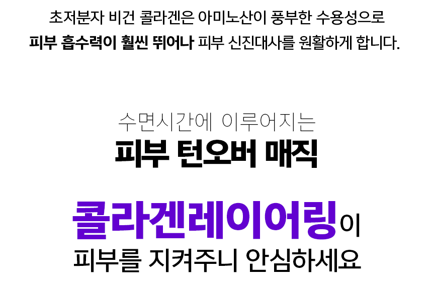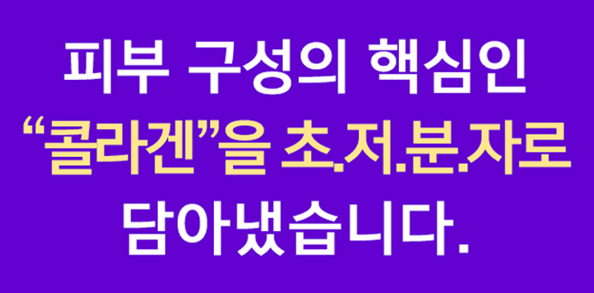 초저분자 콜라겐을 성분 파괴 없이 유효 성분이 피부 속까지 공급되도록 콜라겐레이어링이 보호해줍니다.