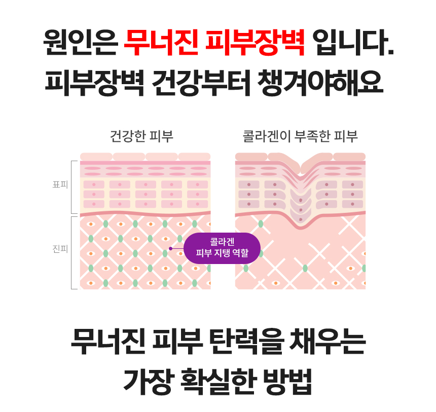 피부는 표피, 진피, 그 밑에 지방층으로 구분되는데 이중 속 피부에 해당하는 진피의 3분의2가 콜라겐입니다.