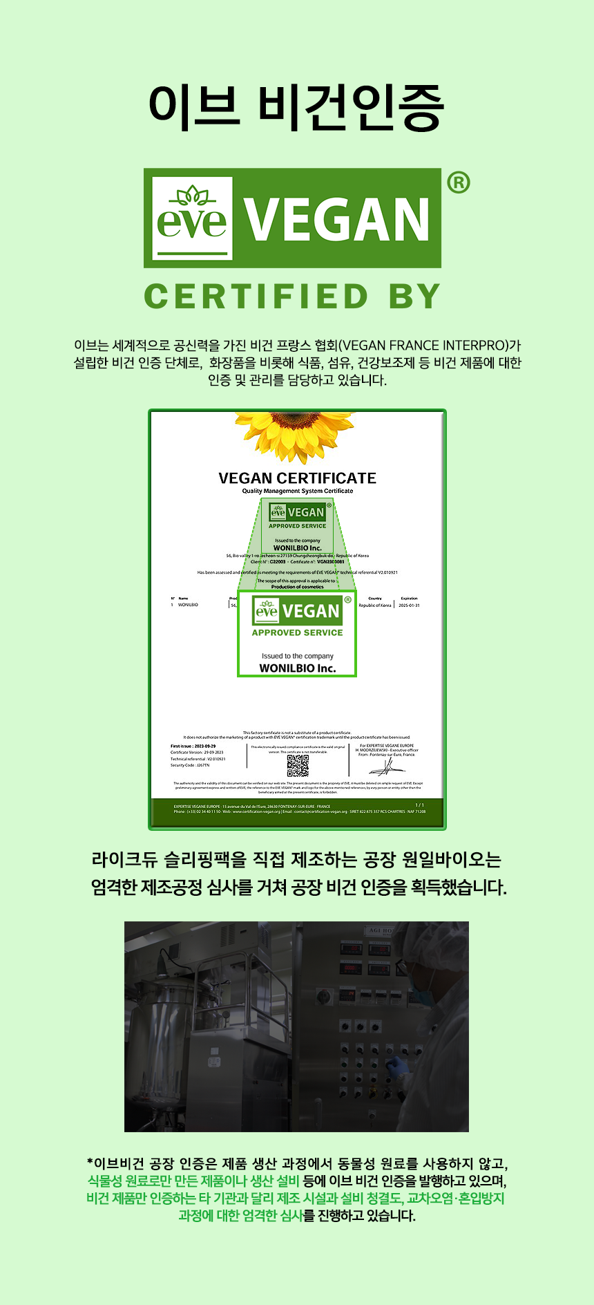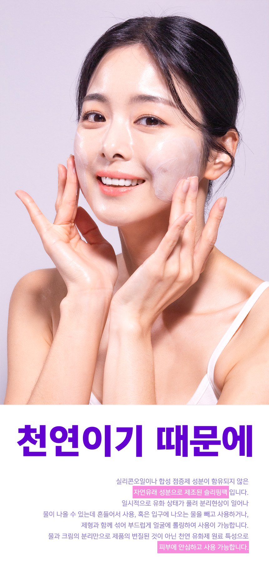 실리콘 오일이나 합성 점증제 성분이 함유되지 않은 자연 유래 성분으로 제조된 슬리핑팩입니다.