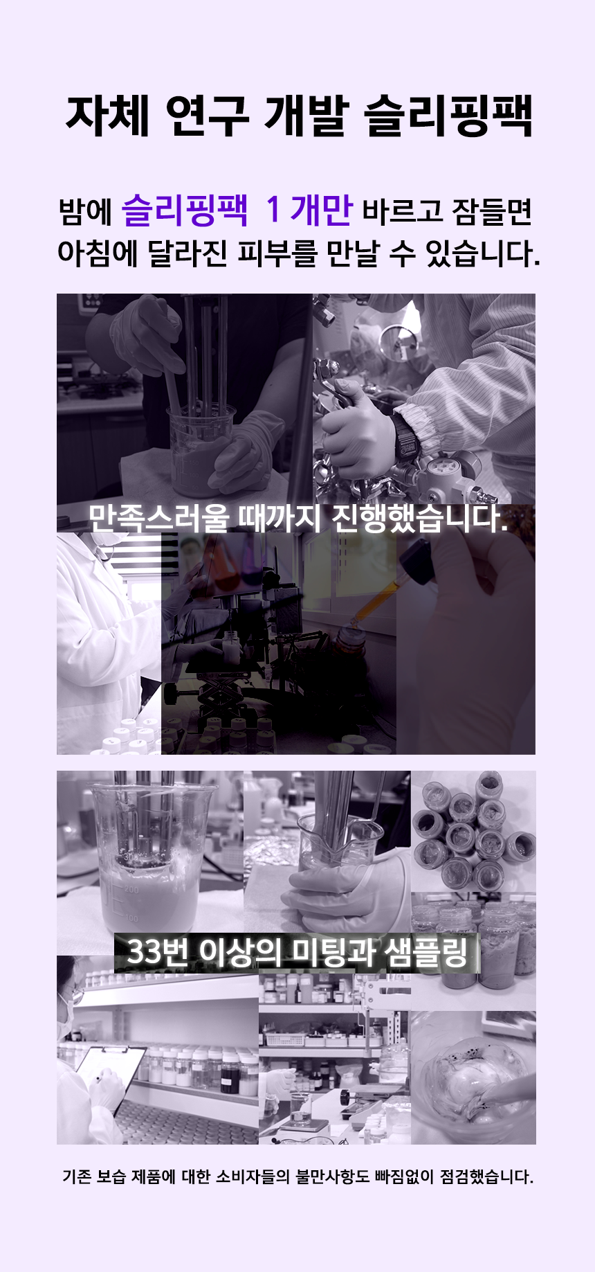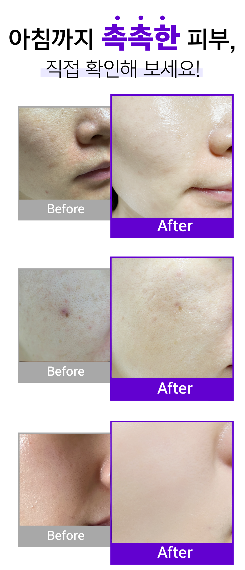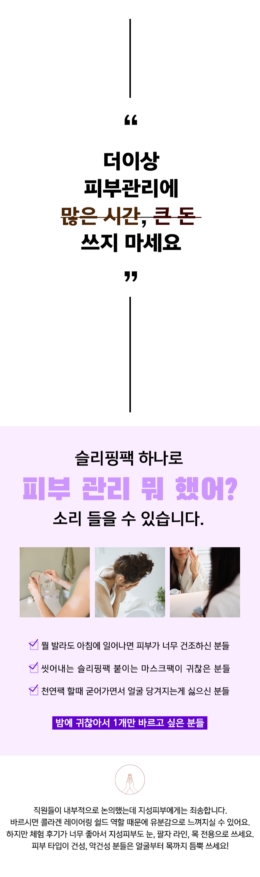 주무시기 전 편하게 슬리핑팩 1개만 바르고 눈 뜬 다음날 피부가 촉촉함을 느끼시고 기뻐하실 서포터님들을 생각하며 준비했습니다. 출근할때 화장이 잘 먹는 즐거움도 누리시구요