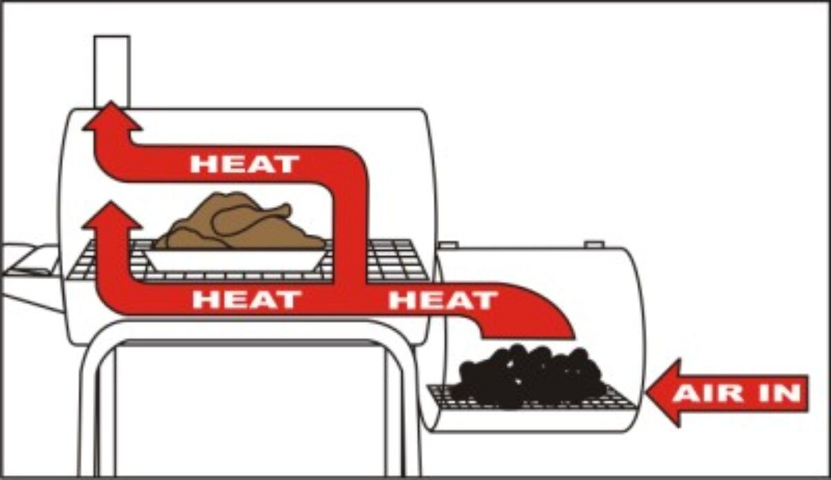 아래 그림을 보시면 메인 CHAMBER (챔버)와 SIDE - BOX(사이드 박스)로 구성되어 있는 바베큐 PIT(피트)는 바베큐 훈제 시 열기와 훈제 연기가 사이드 박스에서 메인 챔버로 공기의 흐름에 따라 흘러 들어가는 구조로 고기와 고기에서 흐르는 기름이 불에 닿지 않아 나쁜 연기가 발생하지 않습니다. 125도 전후의 열기로 LOW & SLOW (낮은 온도로... 천천히...)로 고기를 훈제 하는 방식 입니다.