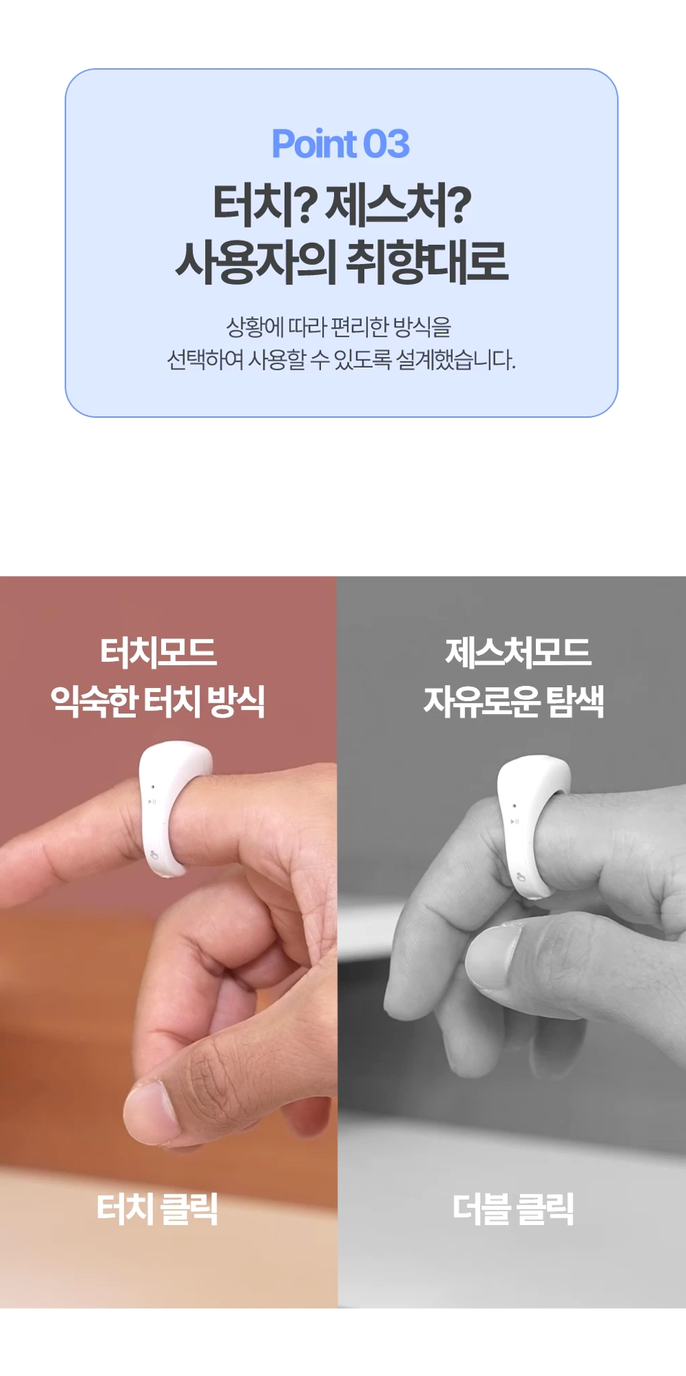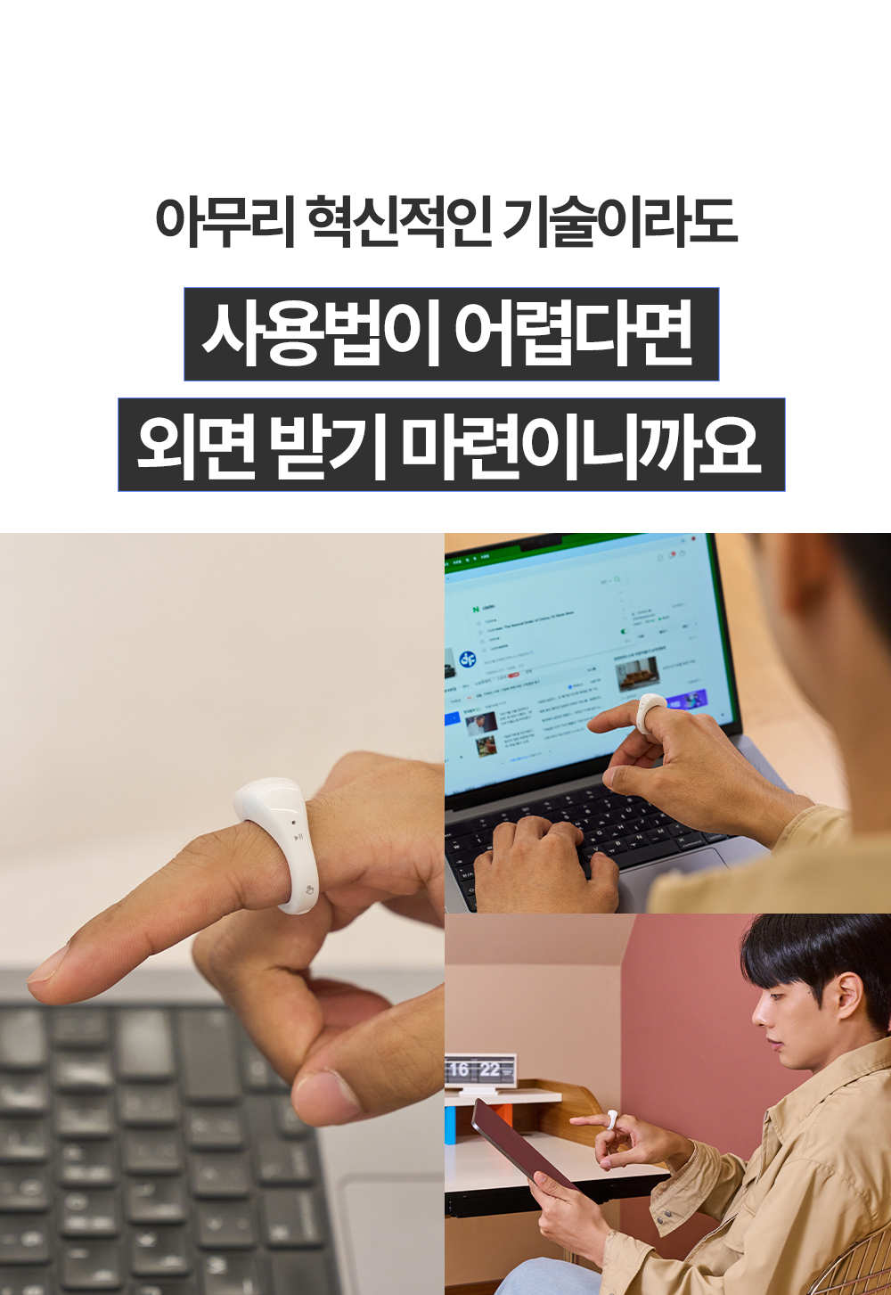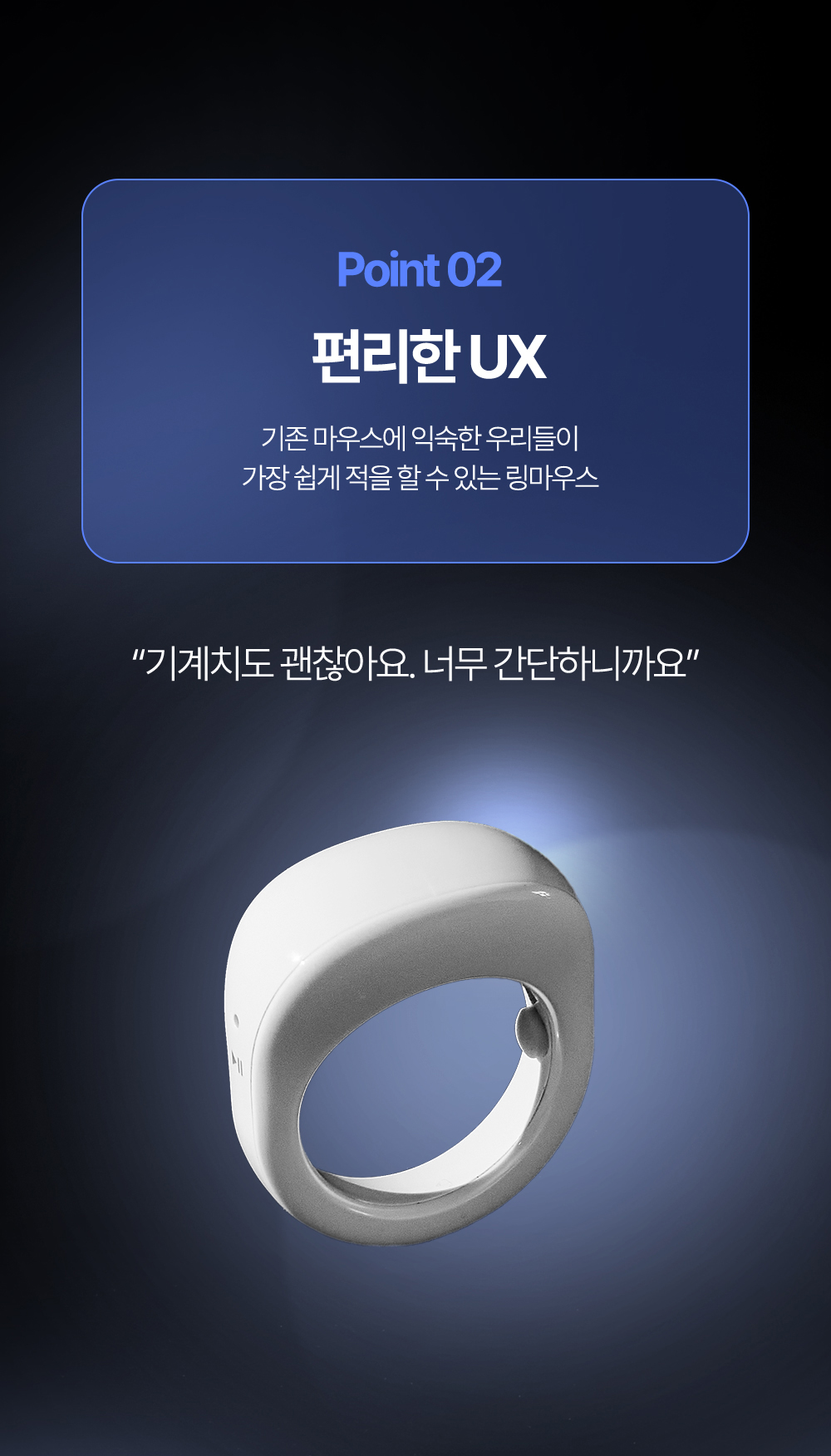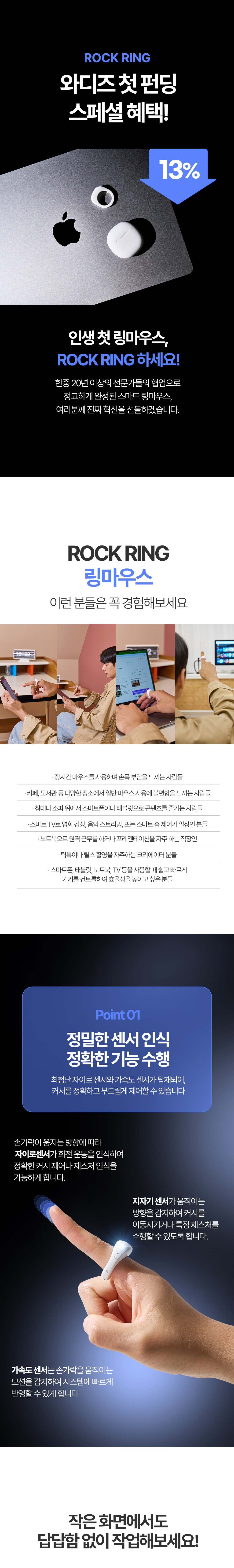 일상생활에서 컴퓨터를 사용하거나 프레젠테이션을 진행할 때, 기존의 마우스는 공간이나 이동에 많은 제약이 있어 불편하다고 느끼는 분들이 많습니다. 특히 공중에서 자유롭게 손가락만으로 편리하게 조작할 수 있다면 얼마나 좋을까 고민하다가 저희 링마우스를 개발하게 되었습니다.