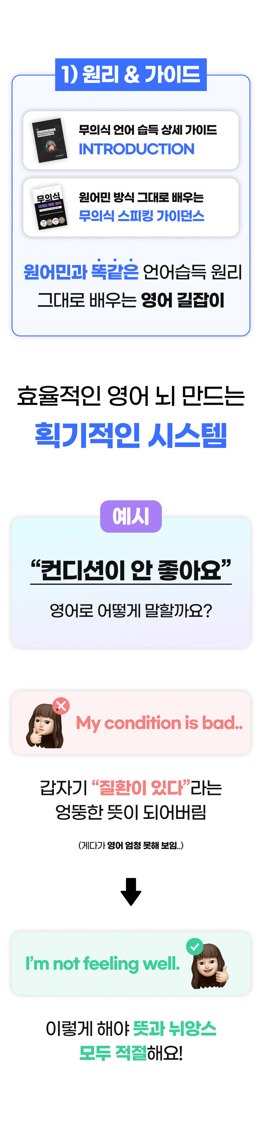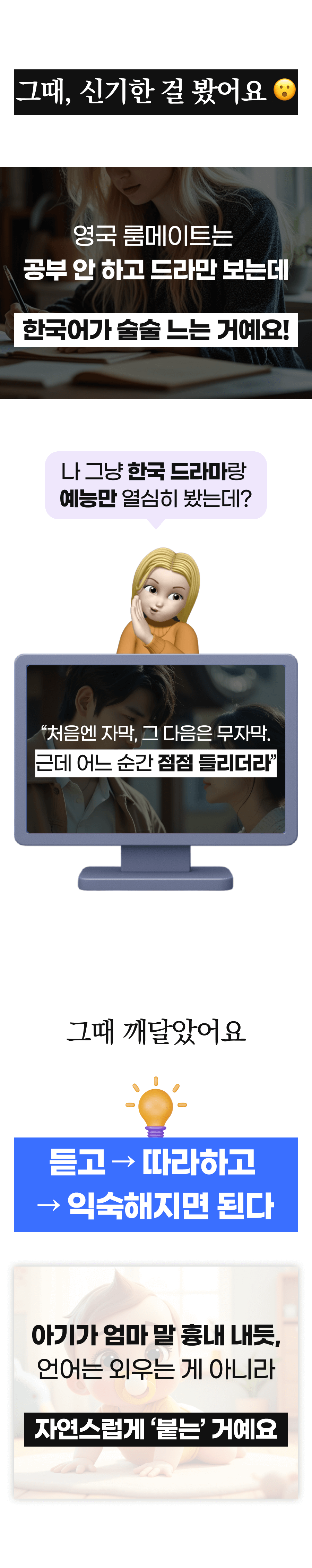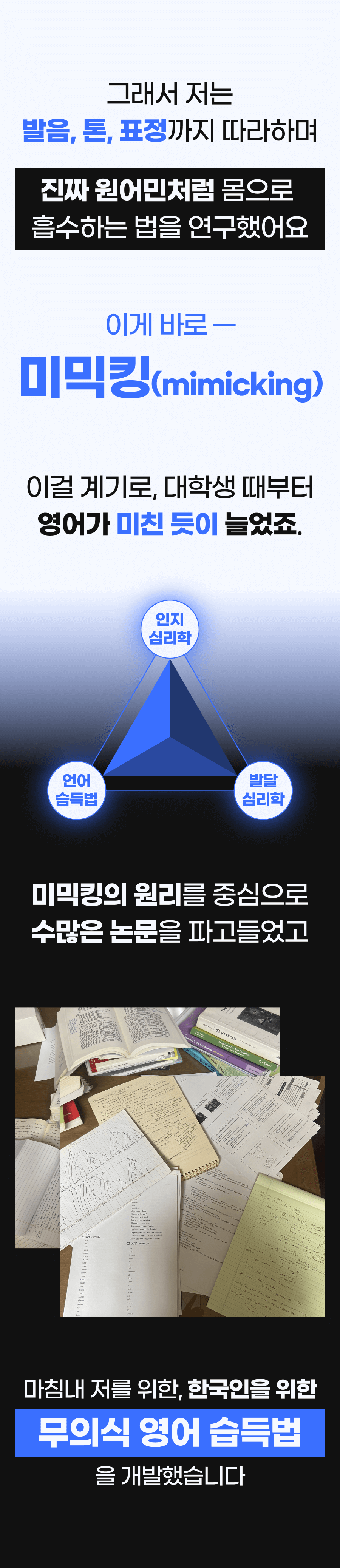 그때부터 저는 한국의 ESL 학생들이 겪는 어려움에 주목했습니다. 영어를 전공했기 때문에 ESL(English as a second language) learner들이 어떤 방식으로 영어를 받아들이는지에 대한 매커니즘은 빠삭하게 알고 있었고, 발달심리학, 인지심리학, 교수법 등 다양한 분야의 이론들을 탐구하고 미친듯이 논문, 아티클, 저널들을 읽기 시작했습니다. '원어민이 영어를 배우는 원리를 한국인도 동일하게 적용할 수 있지 않을까?'라고 막연하게 생각했던 것이 연구와 검증을 거치며 실현 가능해 보였어요!