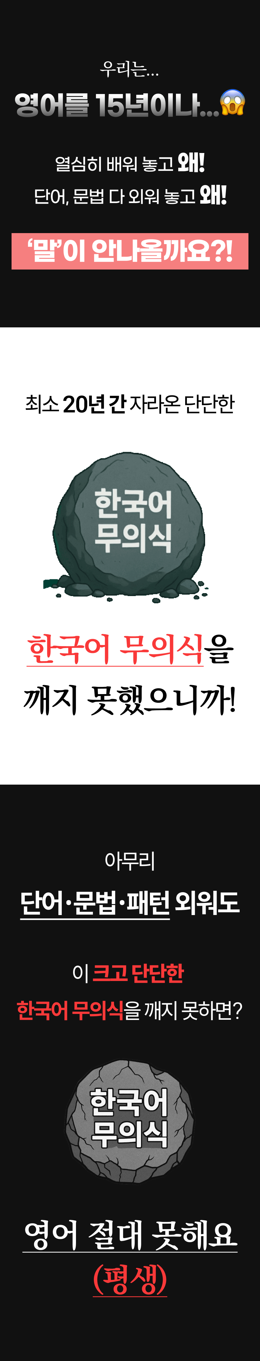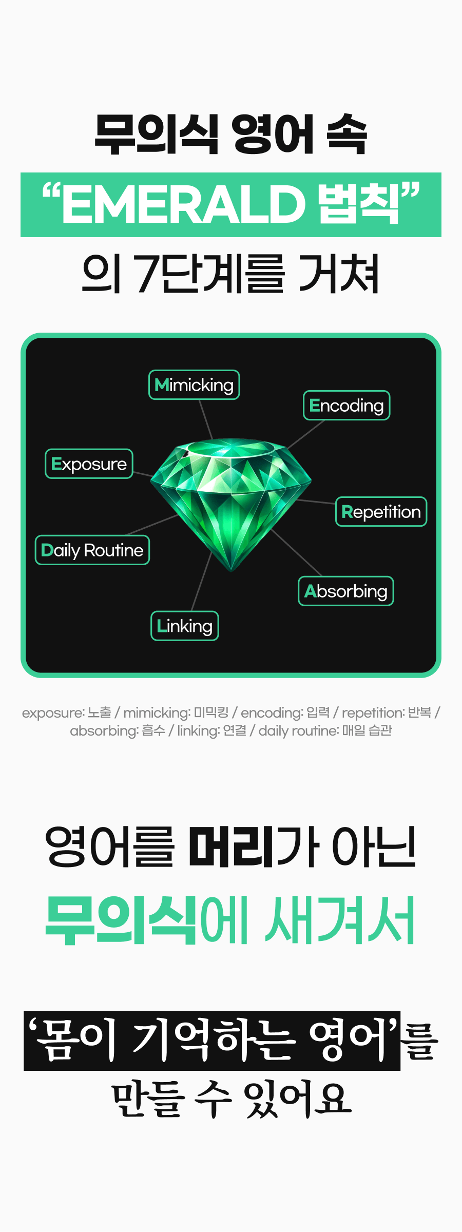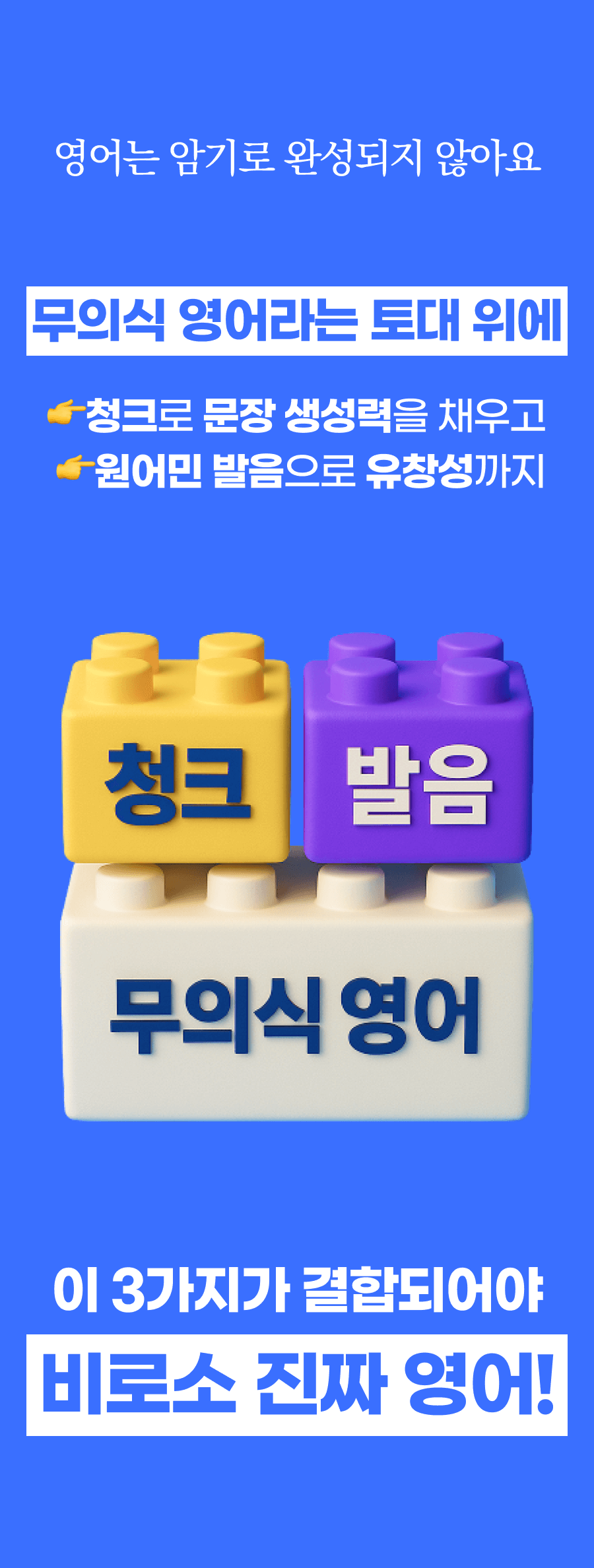그때부터 저는 한국의 ESL 학생들이 겪는 어려움에 주목했습니다. 영어를 전공했기 때문에 ESL(English as a second language) learner들이 어떤 방식으로 영어를 받아들이는지에 대한 매커니즘은 빠삭하게 알고 있었고, 발달심리학, 인지심리학, 교수법 등 다양한 분야의 이론들을 탐구하고 미친듯이 논문, 아티클, 저널들을 읽기 시작했습니다. '원어민이 영어를 배우는 원리를 한국인도 동일하게 적용할 수 있지 않을까?'라고 막연하게 생각했던 것이 연구와 검증을 거치며 실현 가능해 보였어요!