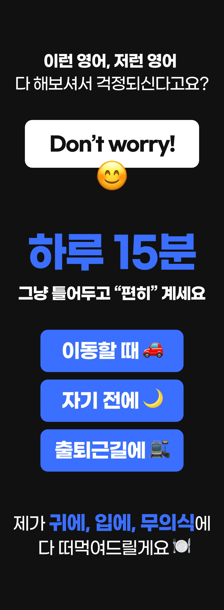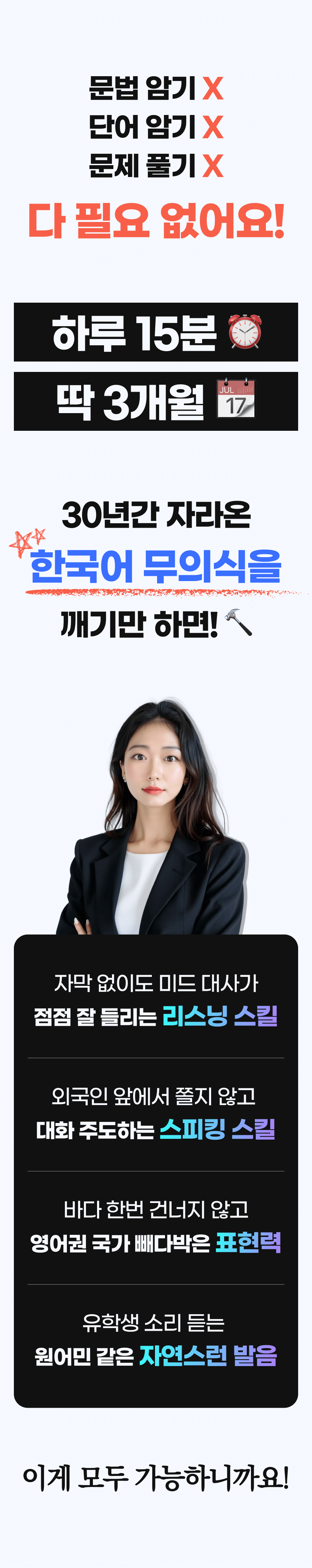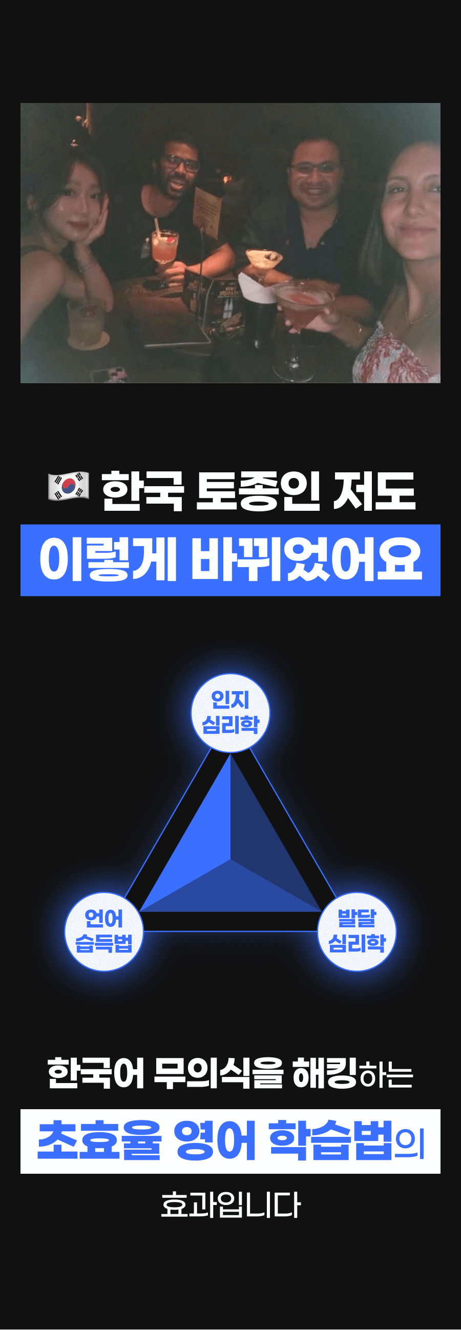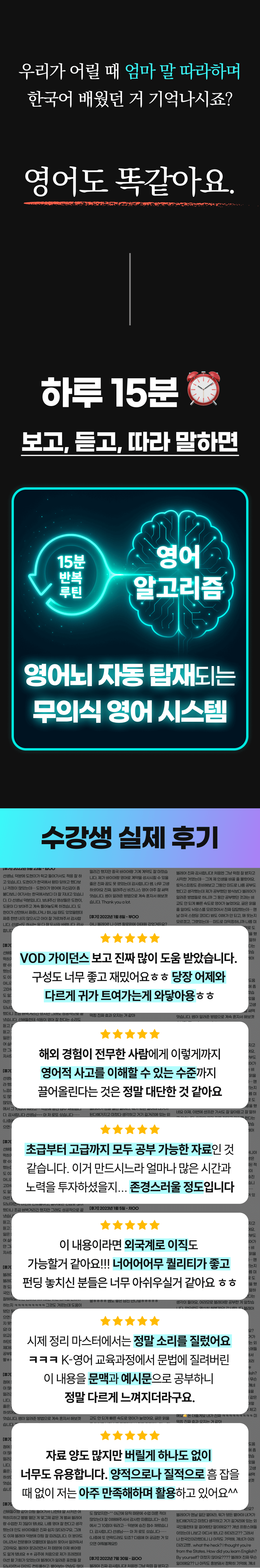 그 결과, 저만의 독특한 '무의식 영어 학습법'을 개발하게 되었습니다. 이 방법은 단기간에 영어 회화 실력을 획기적으로 향상시킬 수 있다는 것을 제 자신을 통해 증명했고, 이후 수강생들에게도 적용해 놀라운 효과를 보았습니다.
