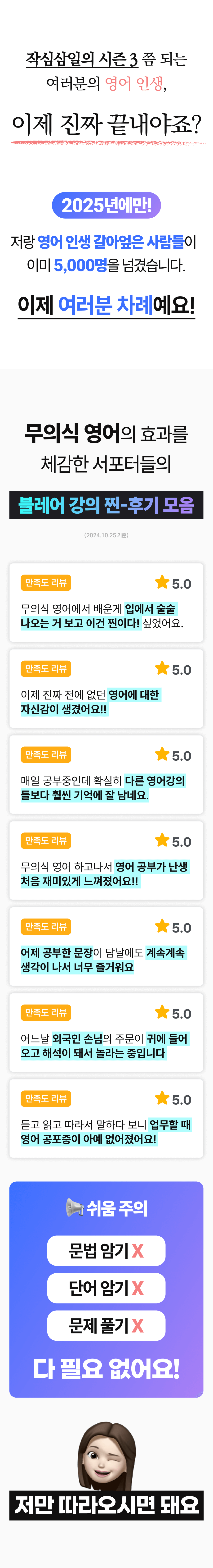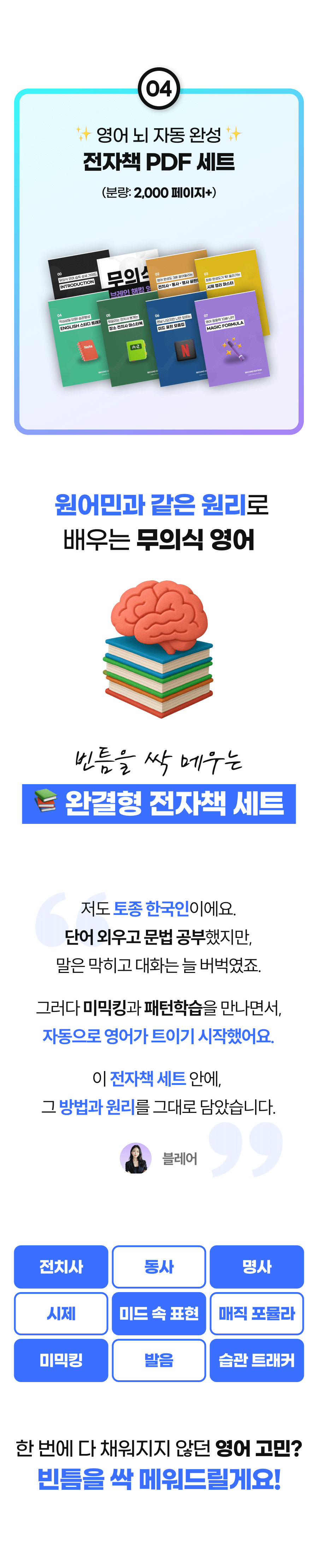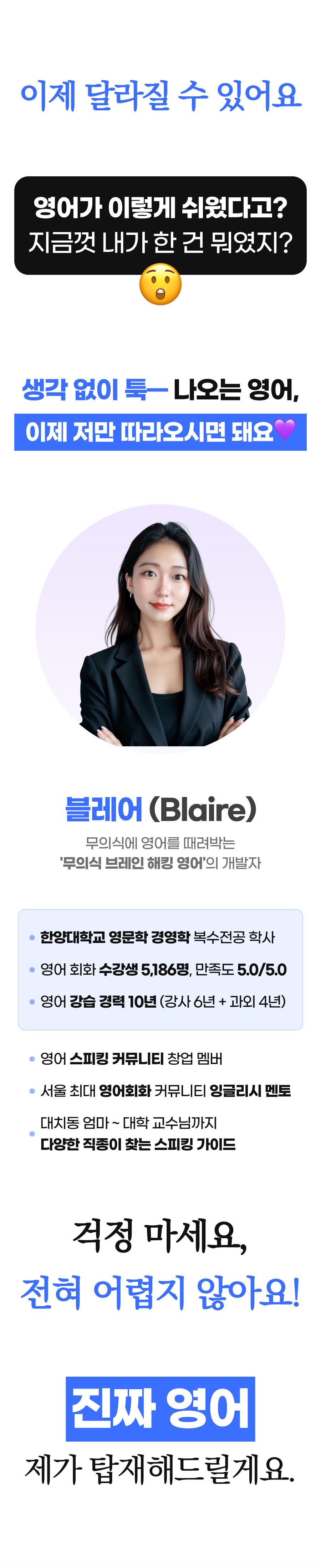 '무의식 영어 학습법'이라는 혁신적인 방법을 통해, 더 많은 사람들이 영어 회화의 장벽을 넘어 자신감을 얻고, 새로운 세계를 경험할 수 있도록 돕고 싶습니다. 이것이 제가 이 프로젝트에 열정을 쏟는 이유이자, 블레어 프로젝트의 핵심 메시지입니다.