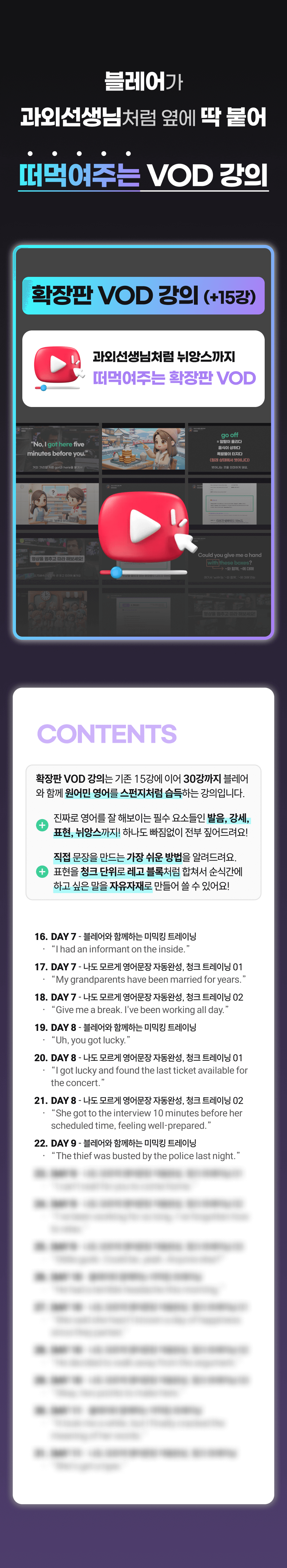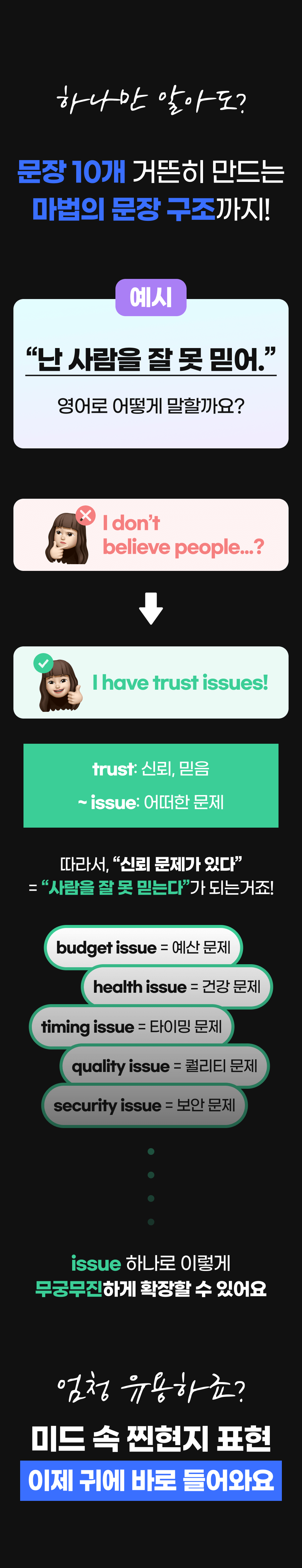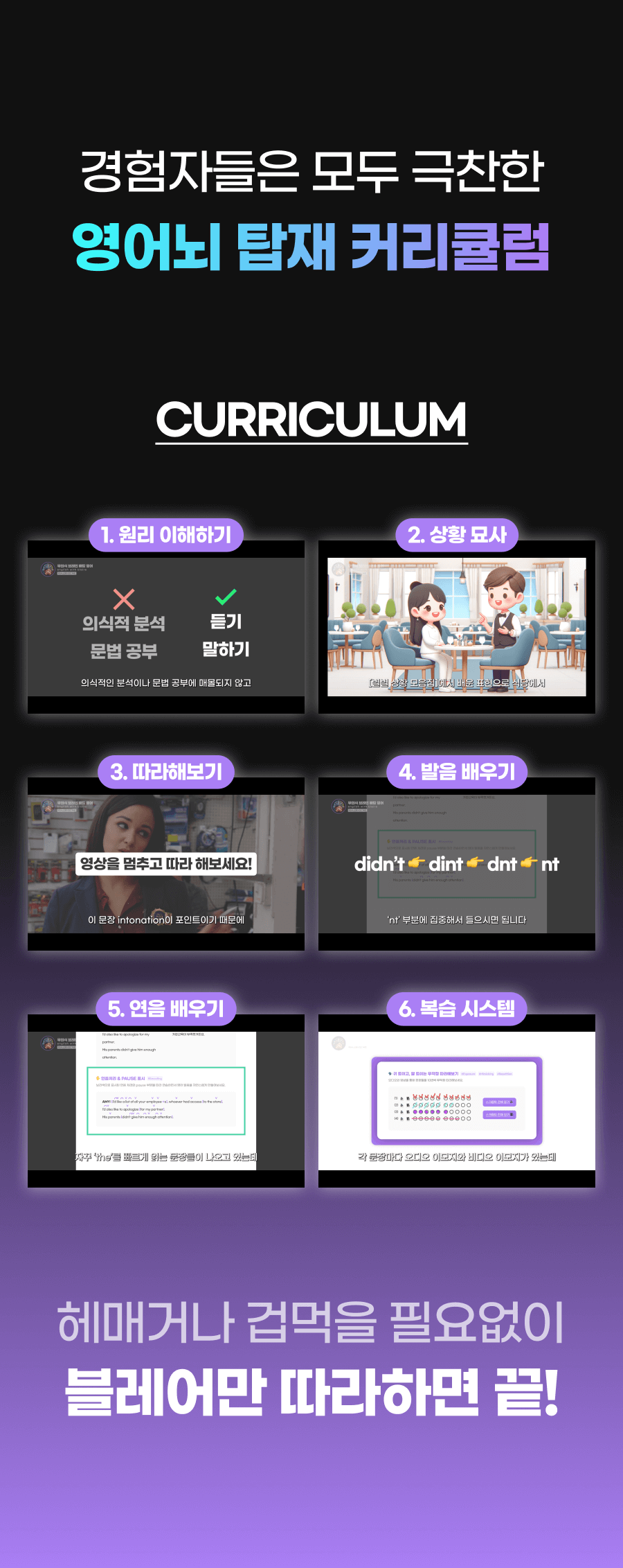 또한, 이 학습법을 체험하게 될 모든 학습자들이 더욱 풍부한 경험을 할 수 있게 하기 위해 추가적으로 다양한 학습 자료를 만들 예정이에요. 학습자들이 영어에 부담을 느끼지 않고 더욱 재미있고 효과적으로 배울 수 있도록 도와주는 것이 목표니까요!