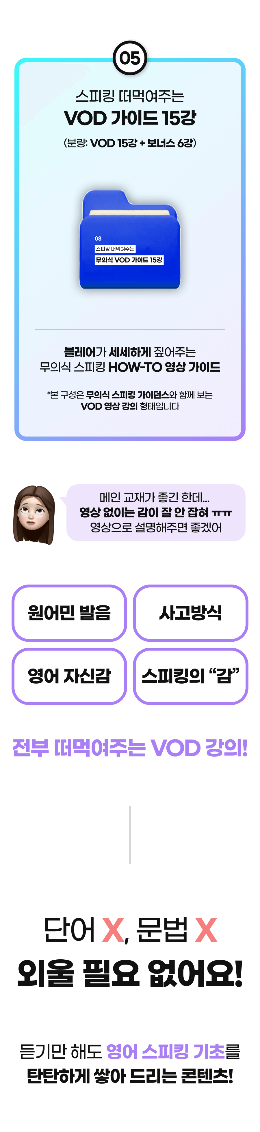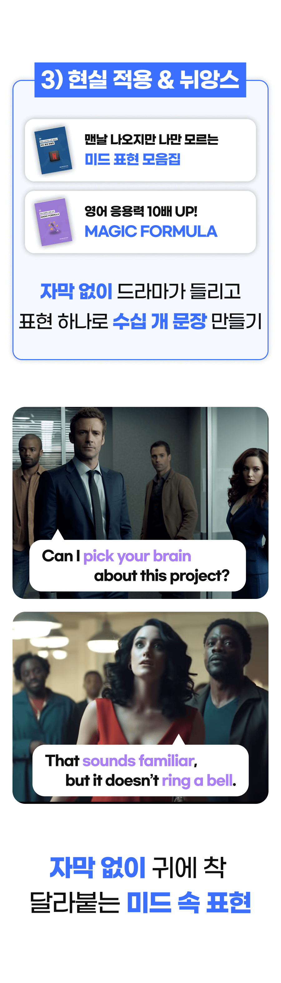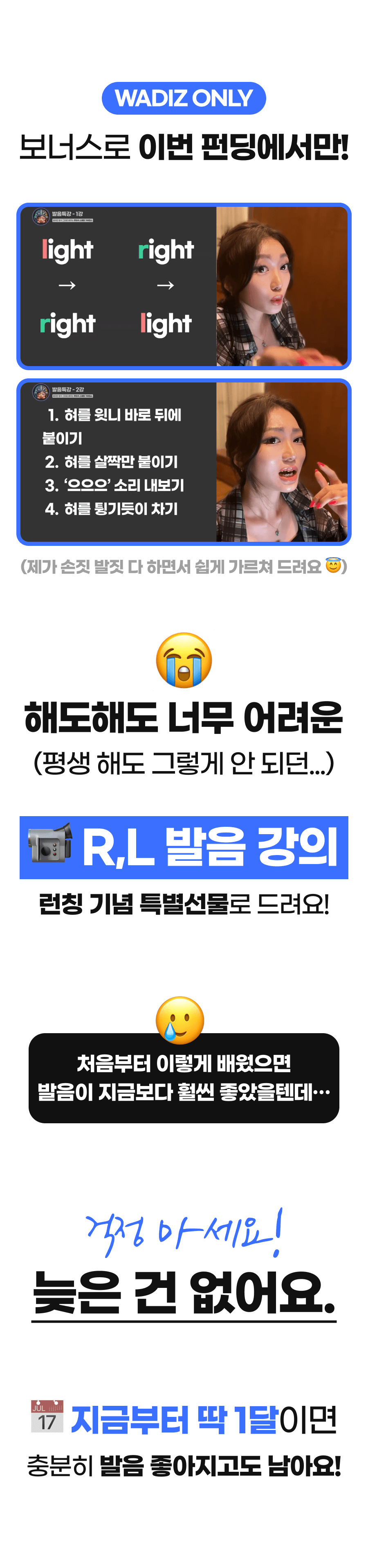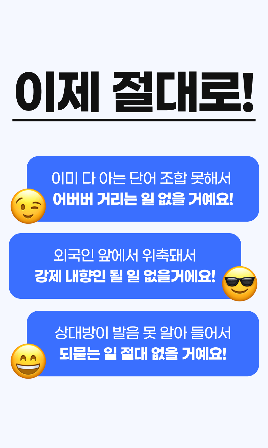 또한, 이 학습법을 체험하게 될 모든 학습자들이 더욱 풍부한 경험을 할 수 있게 하기 위해 추가적으로 다양한 학습 자료를 만들 예정이에요. 학습자들이 영어에 부담을 느끼지 않고 더욱 재미있고 효과적으로 배울 수 있도록 도와주는 것이 목표니까요!