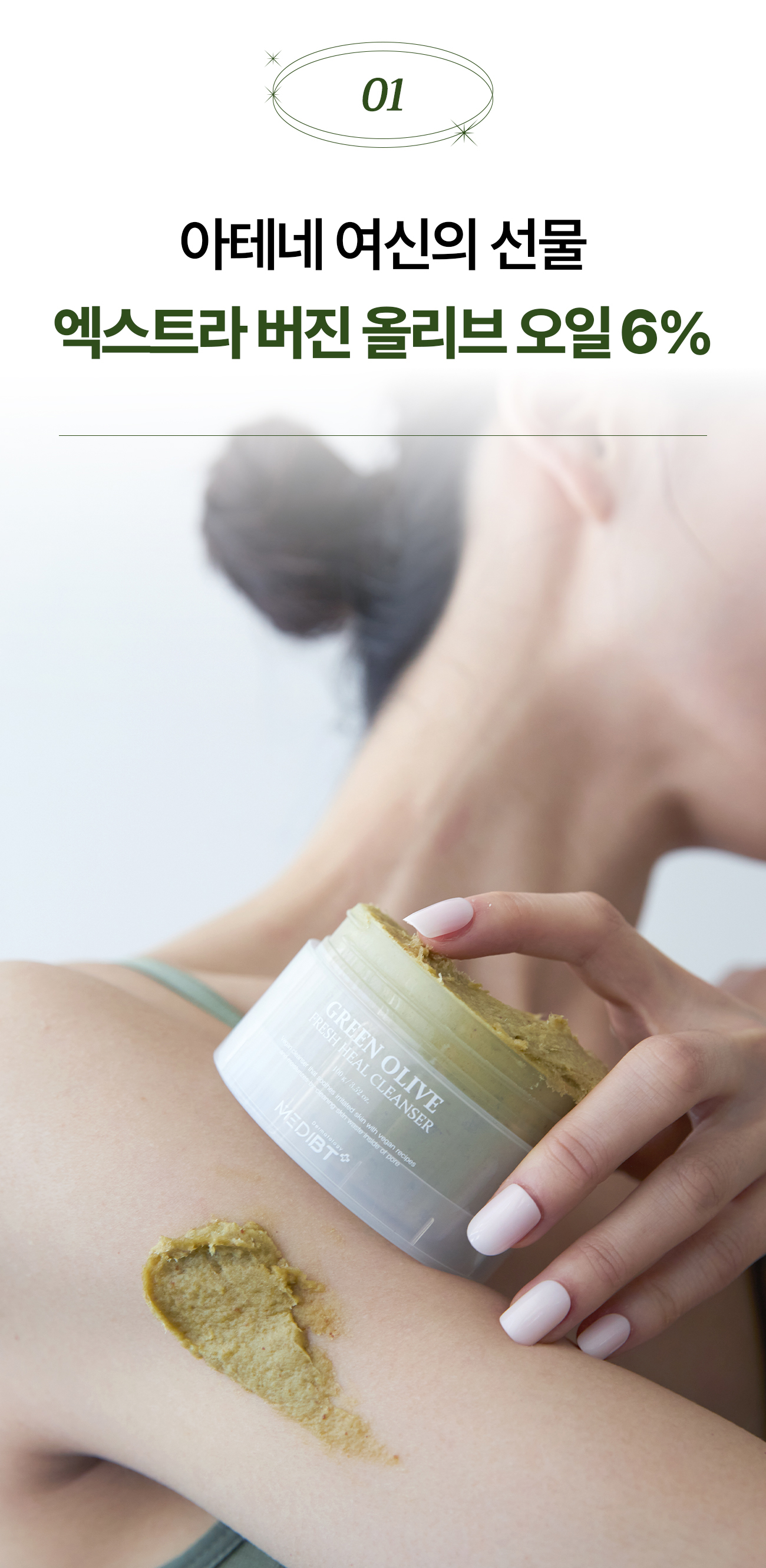 올리브 오일 6%에서 우러난 천연 그대로의 초록빛에서 영감을 받아 지은 이름인데요. 처음 개봉하시고 나면 은은한 올리브 향기에 군침이 도실지도 모르니 주의하세요!