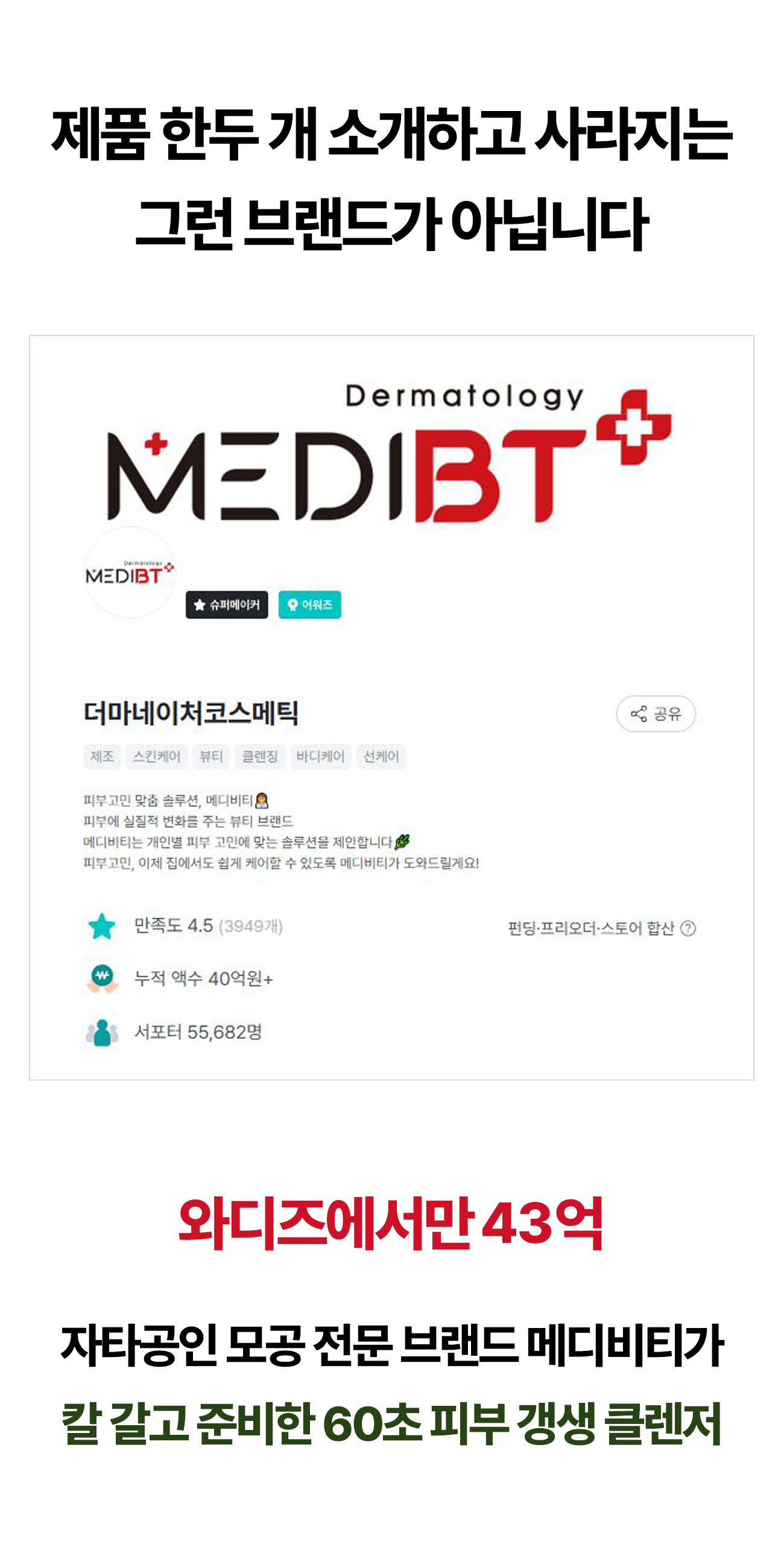 클렌저 단일 품목으로 8억을 모았던 숯카마 이후에 처음으로 선보이는 신내림 클렌저. 숯카마가 태어났던 와디즈에 연어처럼 돌아와 처음으로 소개해 드리는 게 메디비티에겐 당연했어요. 앞서 말씀 드렸듯, 이번 프로젝트로 모인 펀딩금은 신내림 클렌저의 비건 인증을 진행하는데 투자할 예정입니다. 뭐든 임상 결과로 이야기 드리는 메디비티이기에, 동물성 원료가 0% 들어갔다는 것도 비건 인증이라는 정식 서류로 말씀 드리고 싶거든요.