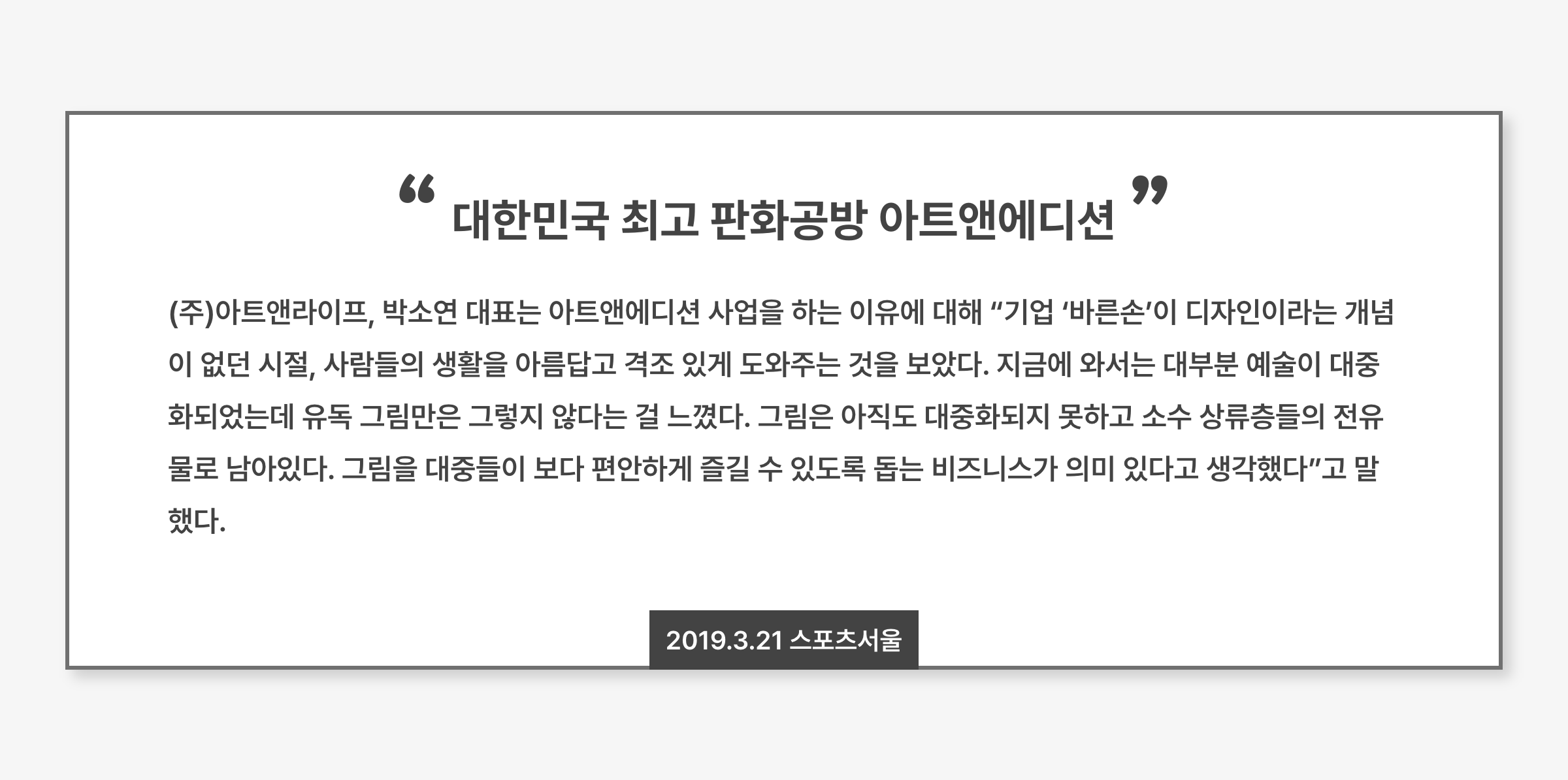- 20년 경력 전문가 노하우로 고화질 디지털 판화와 전통 수작업 판화까지, 원작의 아름다움과 질감을 담은 고퀄리티 에디션 판화가 탄생하는 곳입니다.