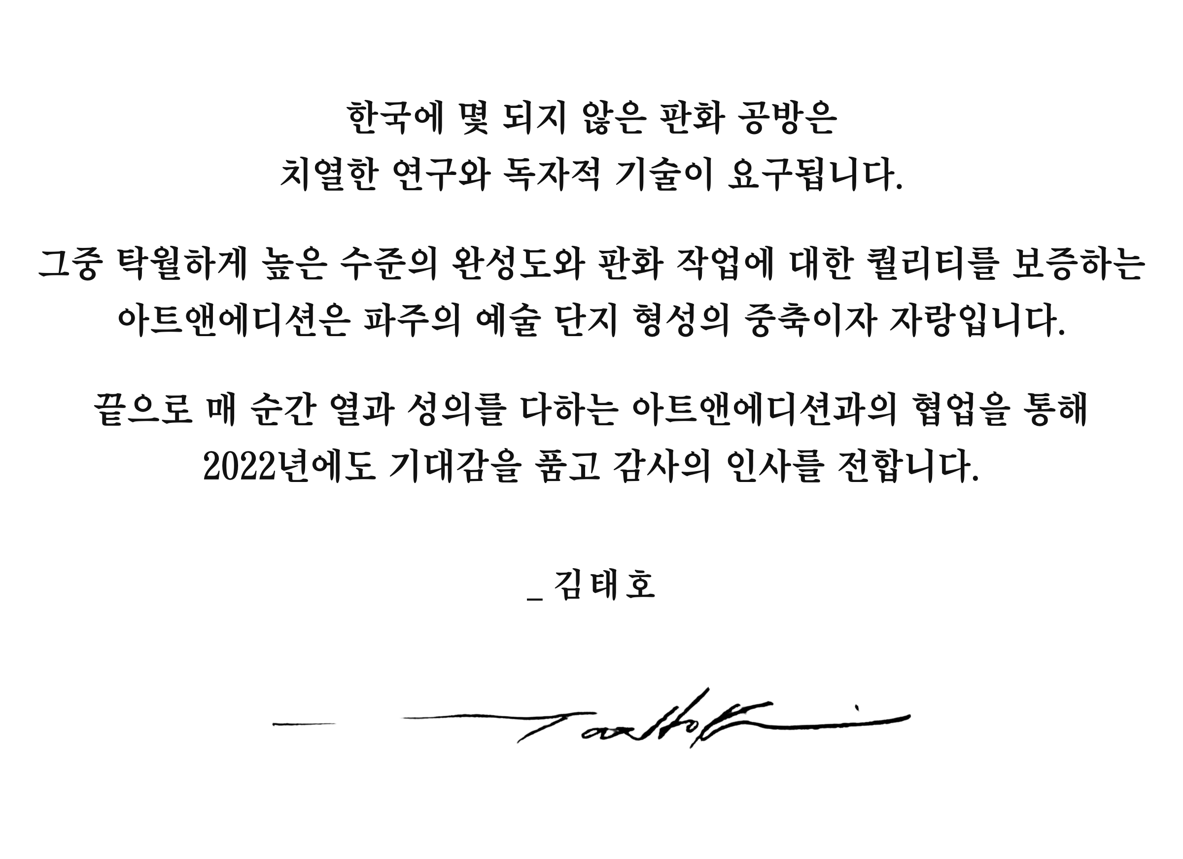- 박서보, 김환기, 유영국, 하종현 등 수많은 유명 아티스트의 에디션 판화를 제작한 아트앤에디션 판화 공방에서 제작합니다.