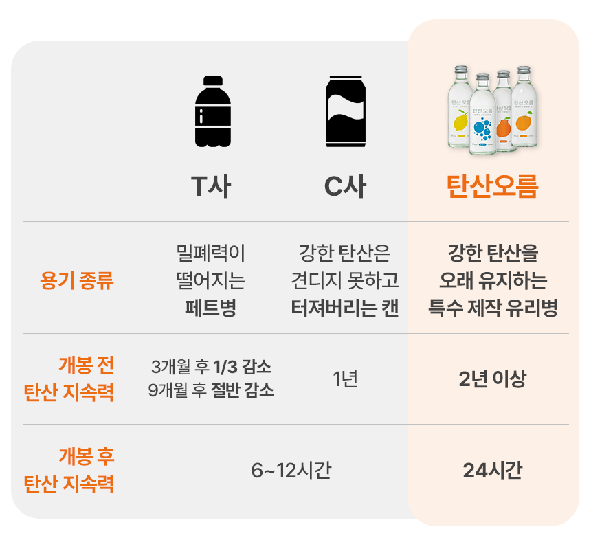 기본적으로 주입한 탄산가스 볼륨도, 개봉 전후 탄산 지속력도 탄산오름이 압도적으로 높으니까요.