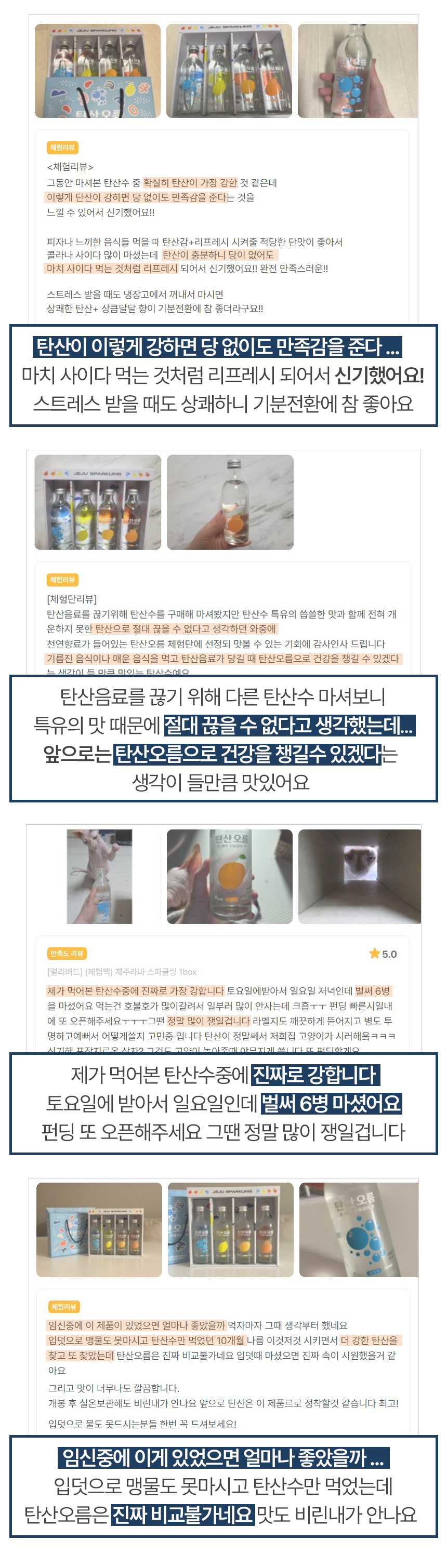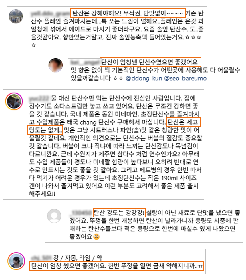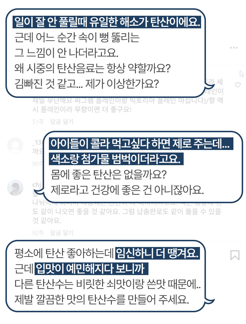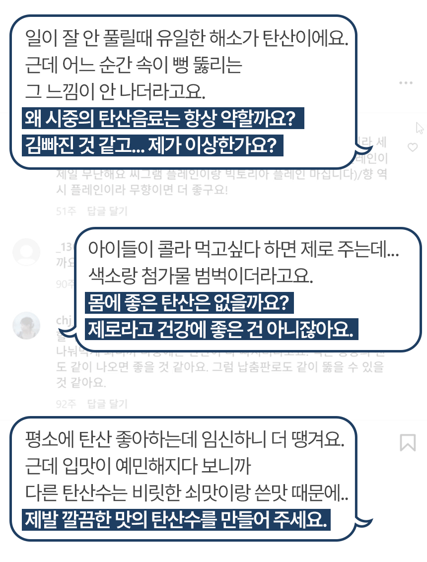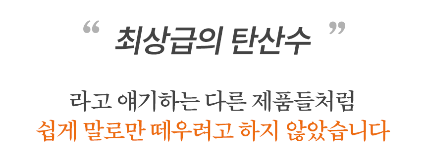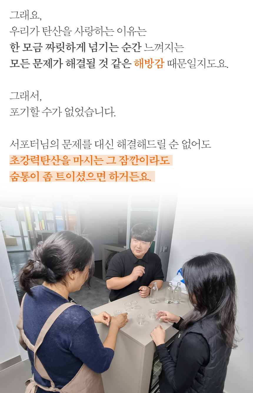 탄산 중독자로서 탄산을 워낙 자주 마셔서 그런지, 기존의 탄산 강도는 너무 약하니, 강한 탄산수를 개발해달라는 요청이 지배적이었습니다. 이렇게 초강력탄산, 탄산오름이 탄생하게 되었죠.