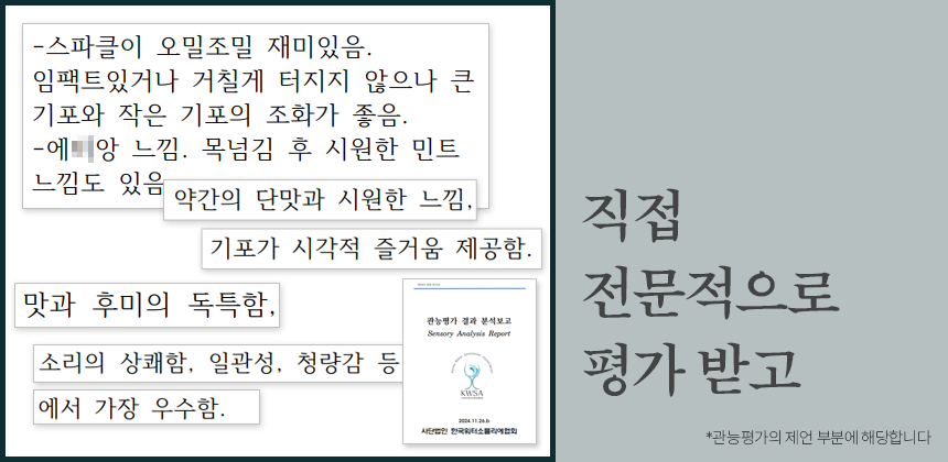 → 밋밋한 목넘김, 시원한 느낌이 금방 사라져버려요 - 탄산오름 : 탄산 방울이 크고 탄산감이 신선하게 톡톡 터짐