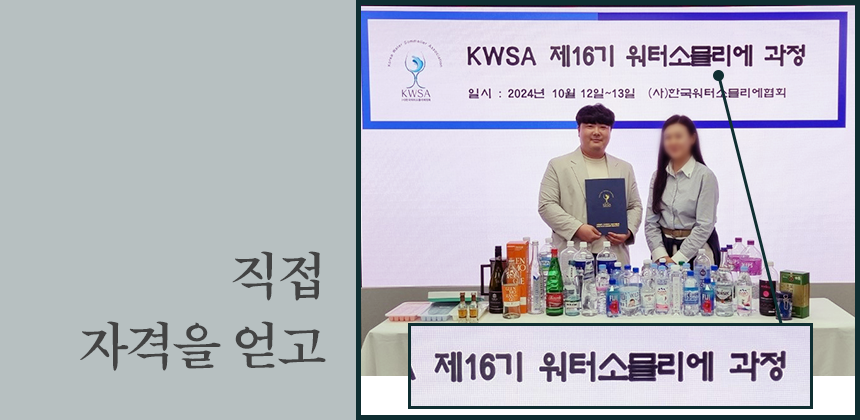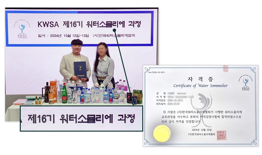 - 미네랄이 풍부하다고 해서 비릿한 맛이 날까봐 걱정이신 분들도 계실텐데, 그런 걱정을 제 스스로도 하지 않고자 워터 소믈리에 자격증까지 따서 물 맛을 공부했습니다.