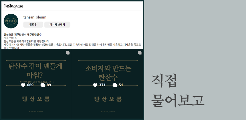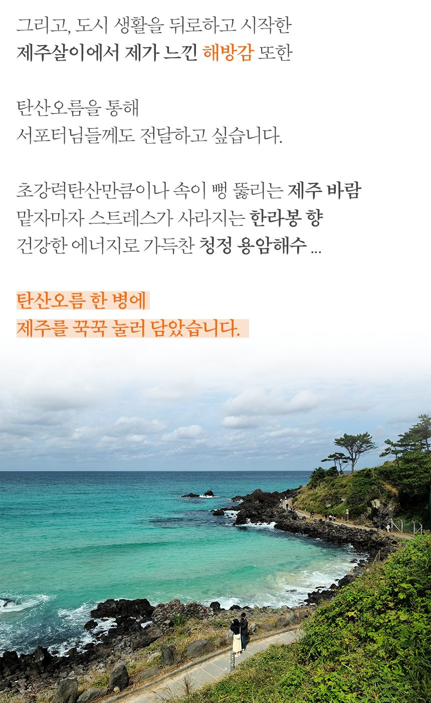 그 과정에서 강한 탄산감을 제공하는 제품이 드물다는 사실을 깨닫고 직접 ‘진짜 탄산수’를 만들어야겠다는 결심을 하게 되었습니다. 제주에 정착해, 바다와 산을 배경으로 새 삶을 시작하며 지역의 청정 자원을 활용해 탄산오름 브랜드를 개발했습니다.