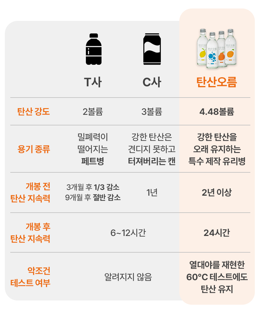 덕분에 저희 탄산오름은 처음 만들어졌을 때부터 최대 2년까지 처음과 같은 탄산을 유지할 수 있어요. 단순히 강한 탄산을 주입하고 끝내는 게 아니라. 지속성까지 생각할 수 있어야 가장 이상적인 탄산이라고 할 수 있으니까요.