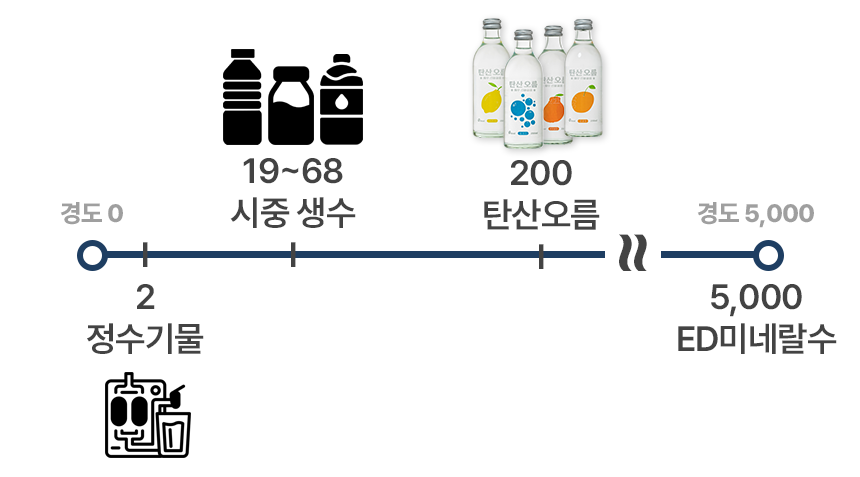 일반 정수기물은 경도 2, 시중 생수는 최대 68인 반면, ED미네랄수는 경도가 5,000에 달합니다. 탄산오름은 이 물을 가지고 경도 200 정도의 탄산수인 탄산오름을 만들고 있어요.