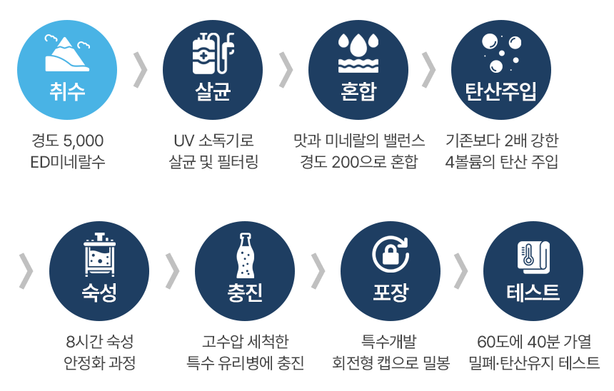 경도 5,000의 ED미네랄수는 그대로는 먹기가 힘들고 정제 과정을 거쳐야 합니다. 그래서 총 8단계의 제조 과정을 거치게 돼요. 살균, 탄산 주입, 그리고 가열 테스트까지 거치면 안전하게 풍부한 미네랄을 섭취하실 수 있어요.