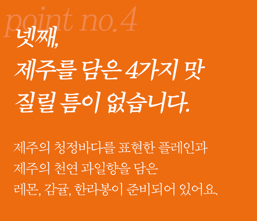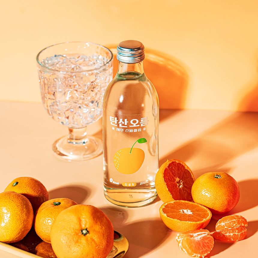 제주의 겨울을 탄산수로도 만나볼 수 있는 감귤입니다. 특유의 따스한 향이 탄산수에 녹아들어 마치 제주 감귤밭에서 막 딴 과일을 즐기는 듯한 기분이 들 거예요.