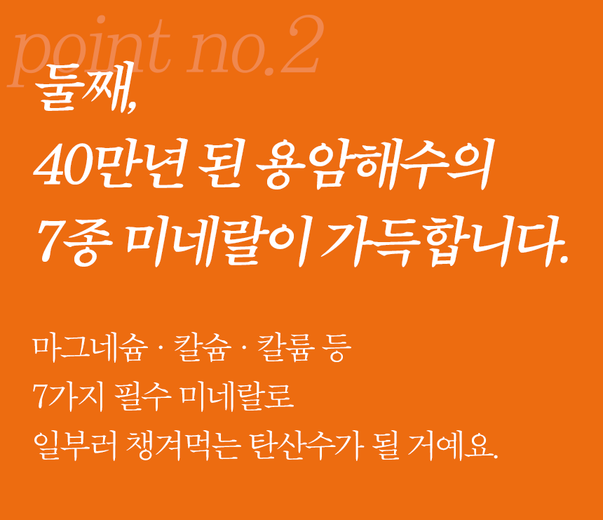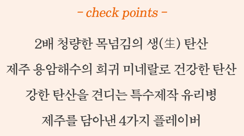 마침내 미네랄이 풍부한 제주용암해수와 강력한 탄산의 조화를 완성했던 순간, 얼마나 기뻤던지요. 누구에게나 자신 있게 소개할 수 있는 탄산수를 만들게 되어 행복한 요즘입니다.