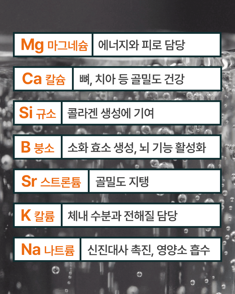 일반적으로 탄산음료에 영양분이 있다고 생각하기는 힘든데요. 탄산오름에는 7종의 미네랄이 들어있습니다. 마그네슘, 칼슘, 규소, 붕소, 스트론튬, 칼륨, 나트륨인데요. 위에는 대표적인 3개 성분을 꼽아봤지만, 그 외 일반 음식으로는 섭취하기 힘든 희귀 미네랄도 잔뜩 들어가 있답니다.