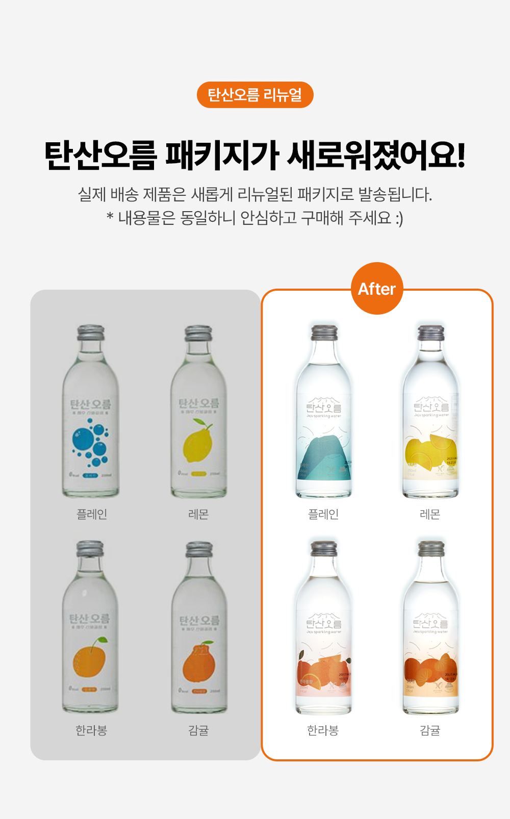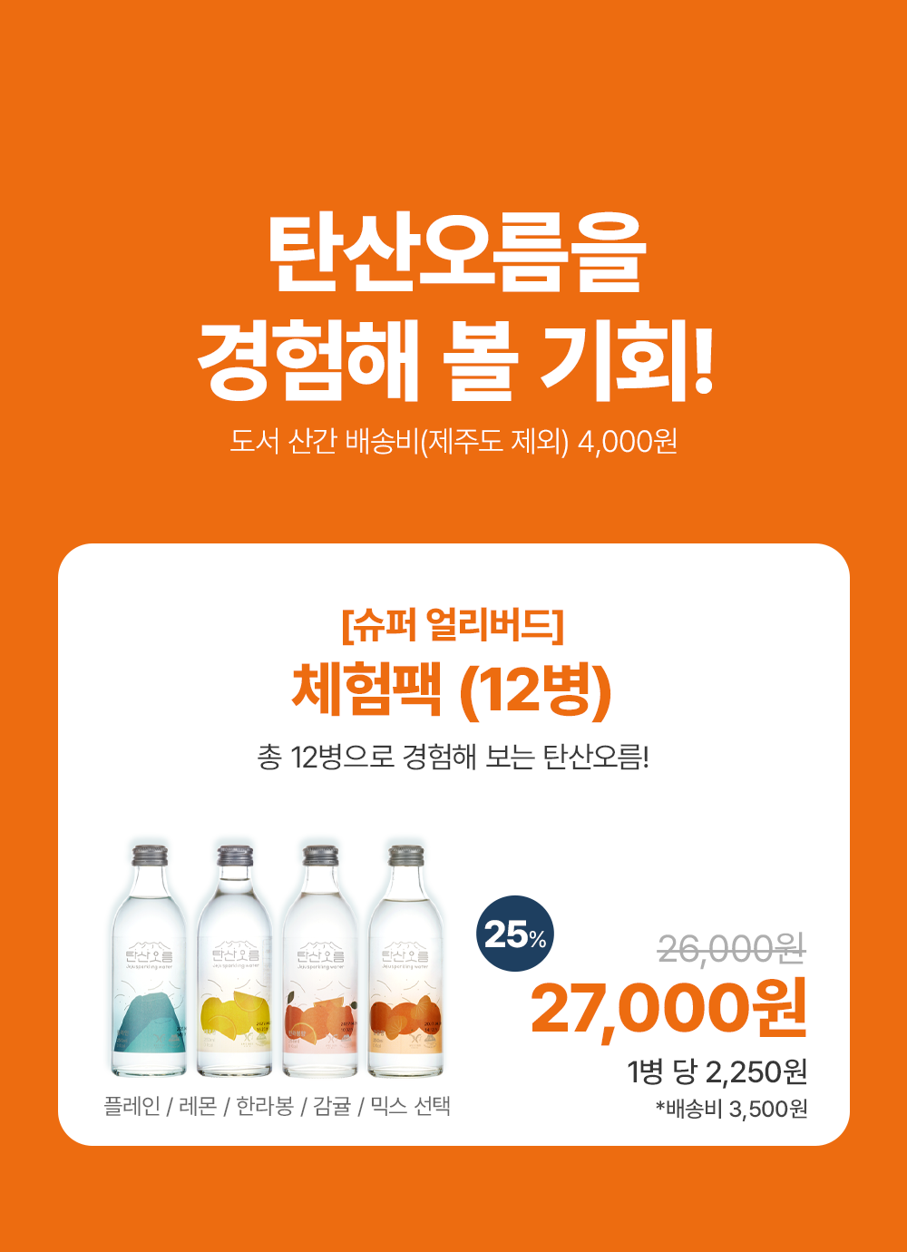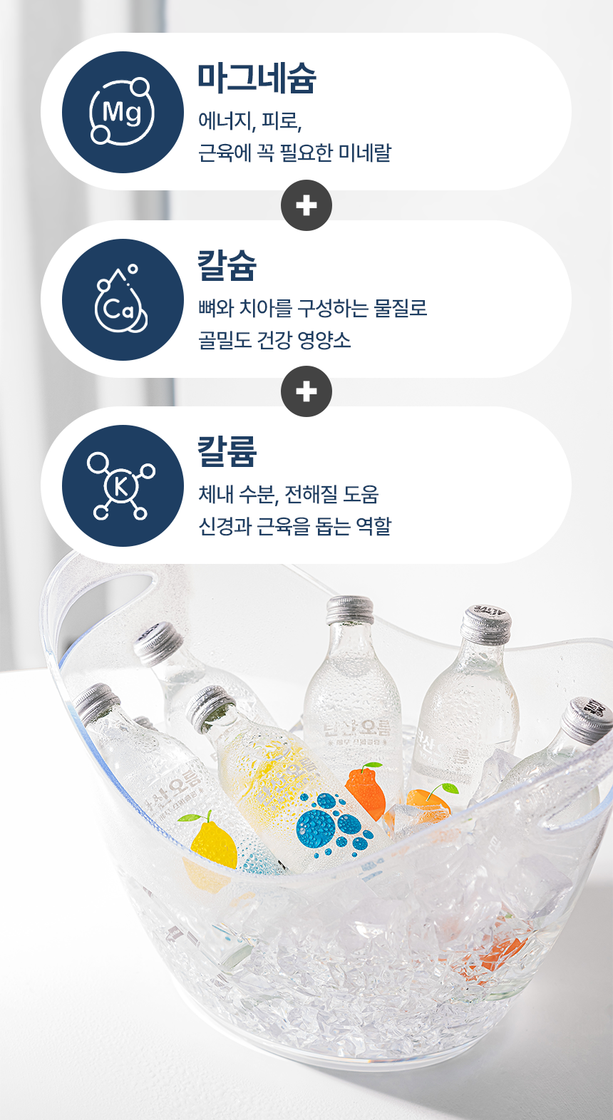 특히 탄산수는 치아에 안 좋다는 편견을 가지신 분들 많으시죠? 탄산오름은 풍부한 미네랄 덕분에 이런 걱정을 덜어내실 수 있을 거예요.