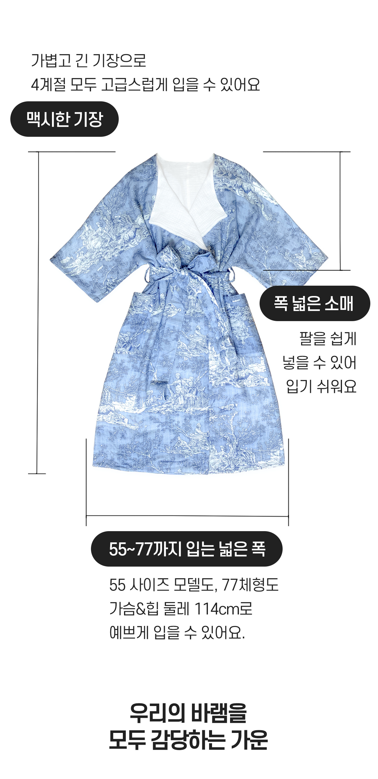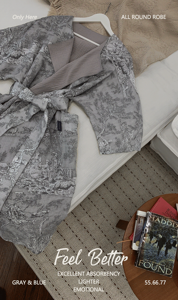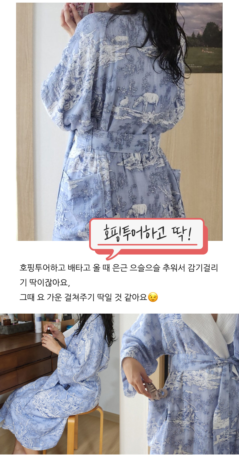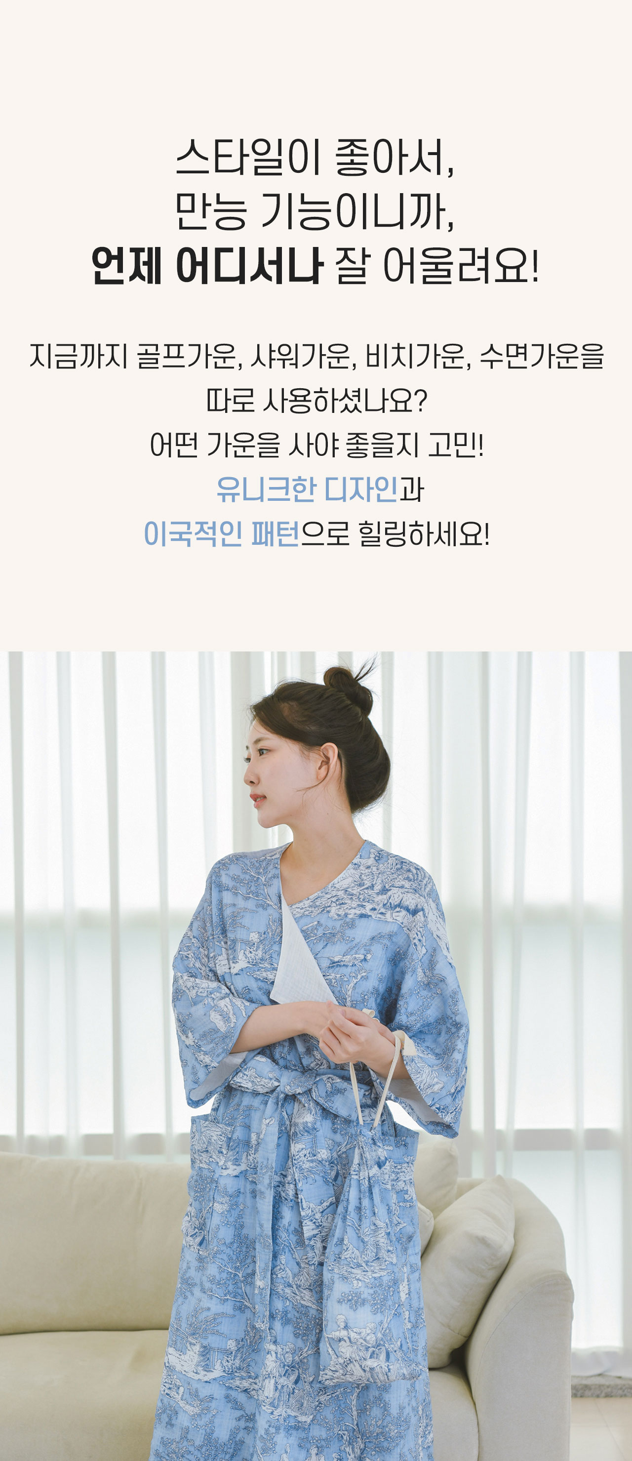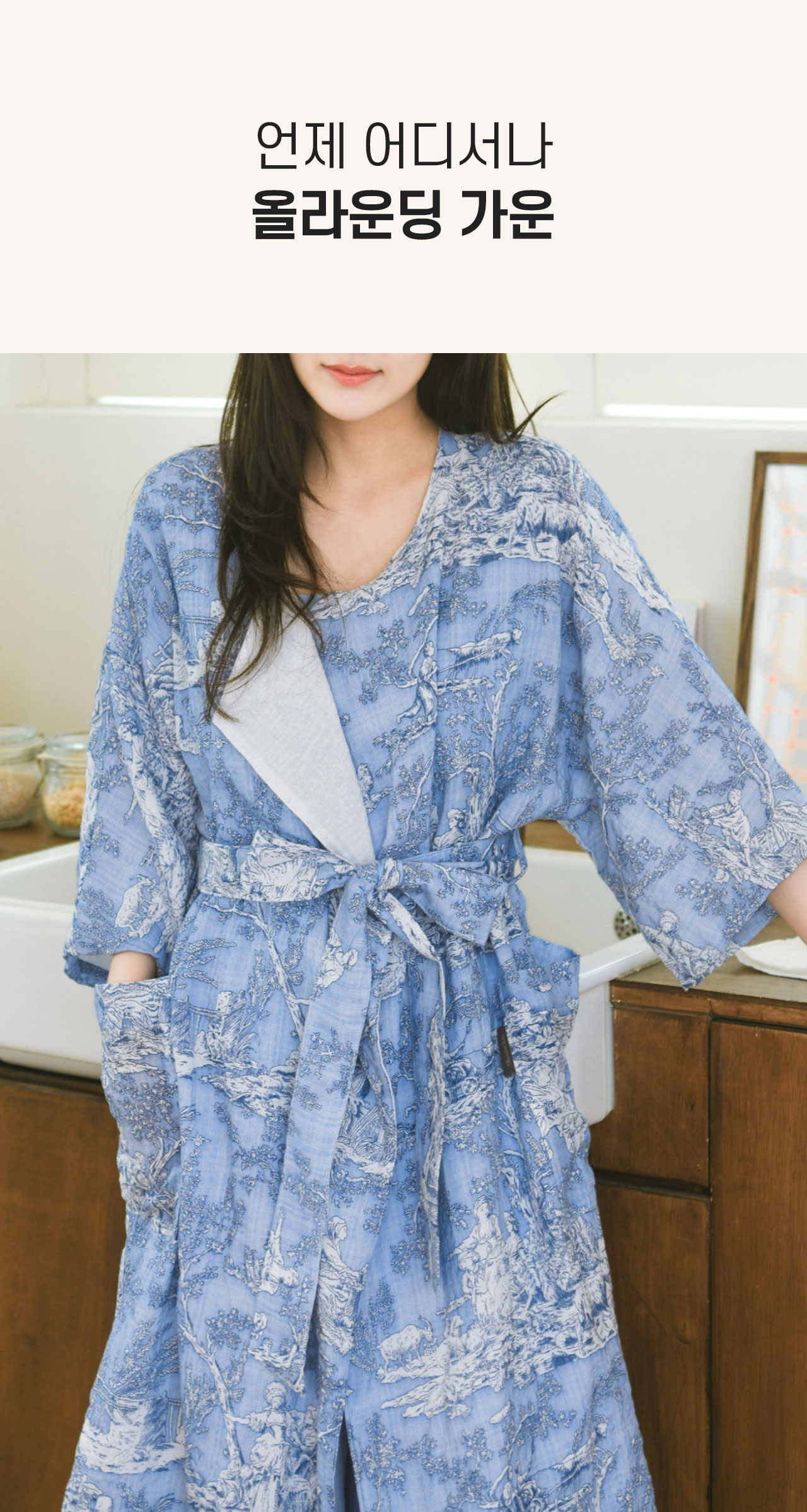 샤워, 골프, 물놀이, 수면 시 모두 사용하는 감성편리템 [올가운딩가운]은 고급스러운 스타일과 피부에 좋은 부드러운 원단을 모두 갖추어 감성과 활용도를 확장시킨 4계절가운입니다.
