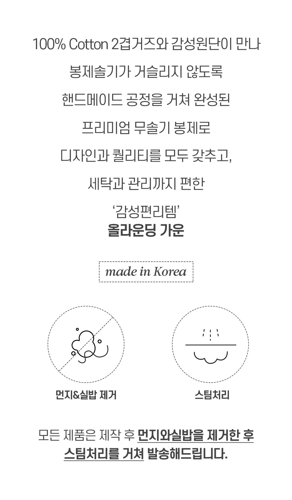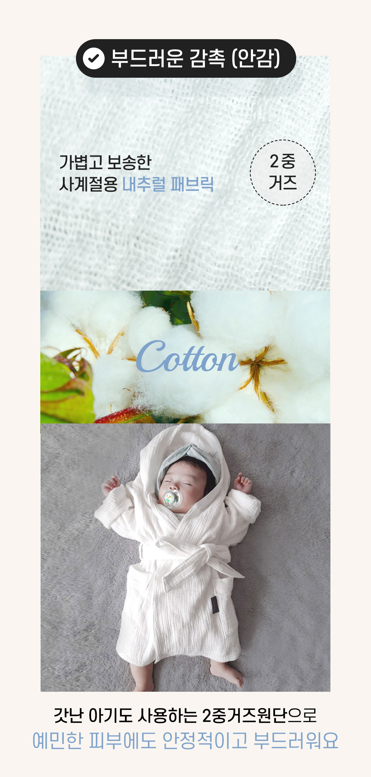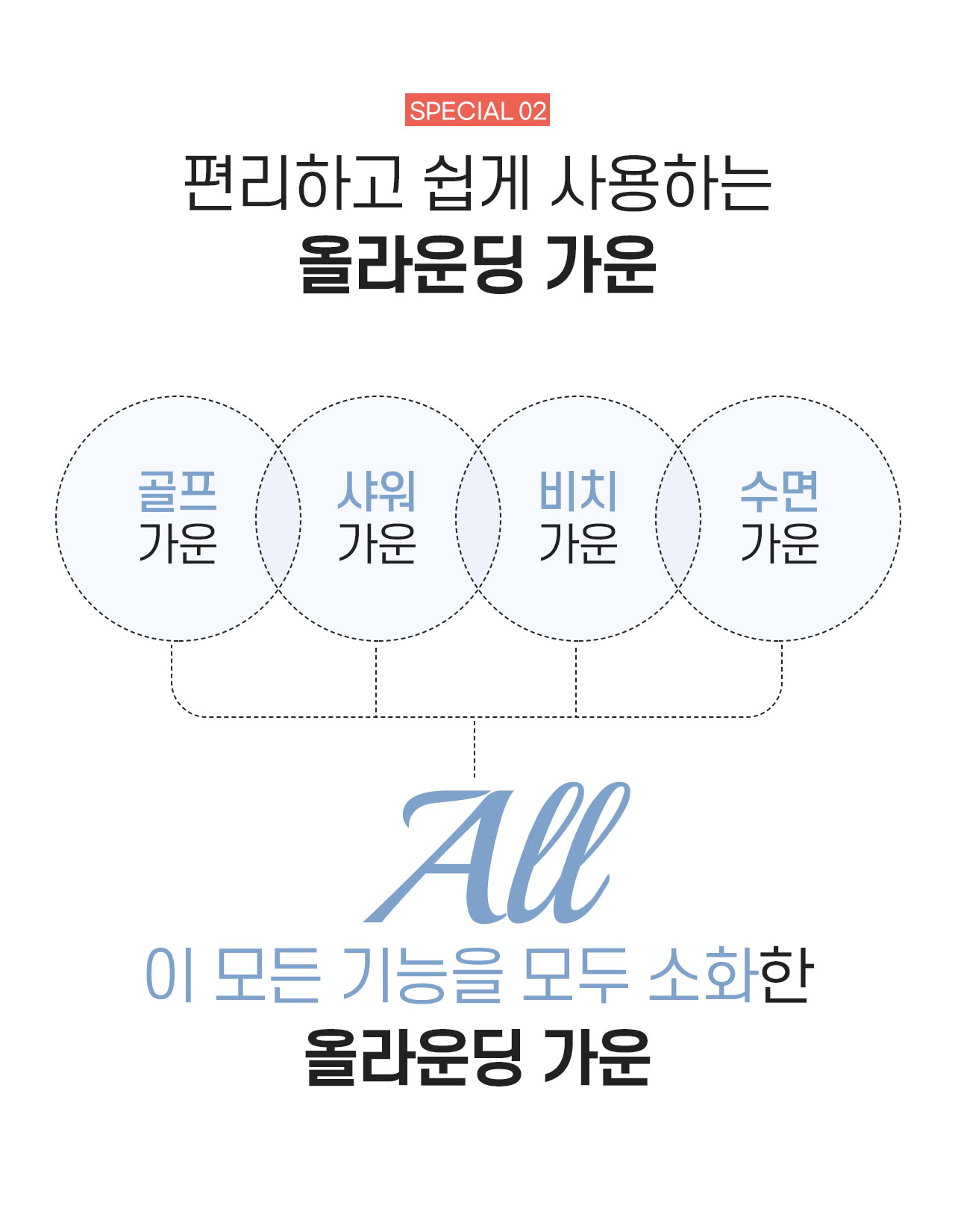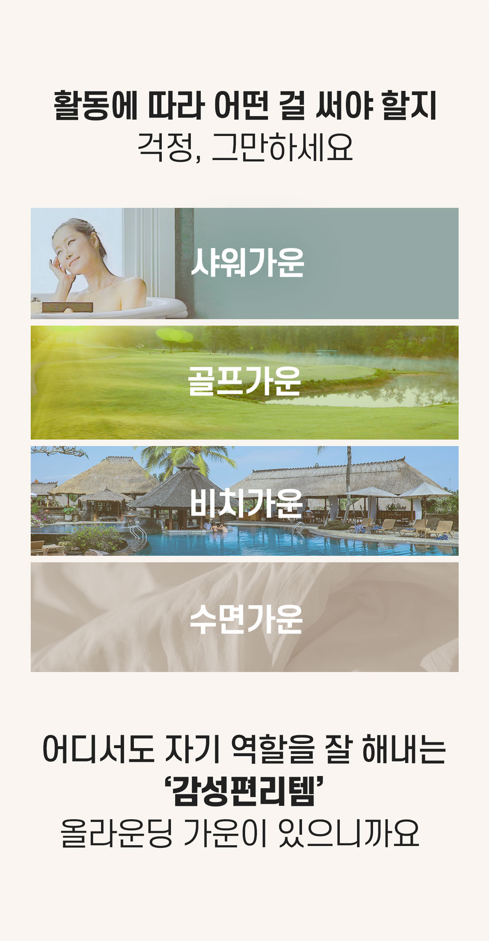 샤워, 골프, 물놀이, 수면 시 모두 사용하는 감성편리템 [올가운딩가운]은 고급스러운 스타일과 피부에 좋은 부드러운 원단을 모두 갖추어 감성과 활용도를 확장시킨 4계절가운입니다.