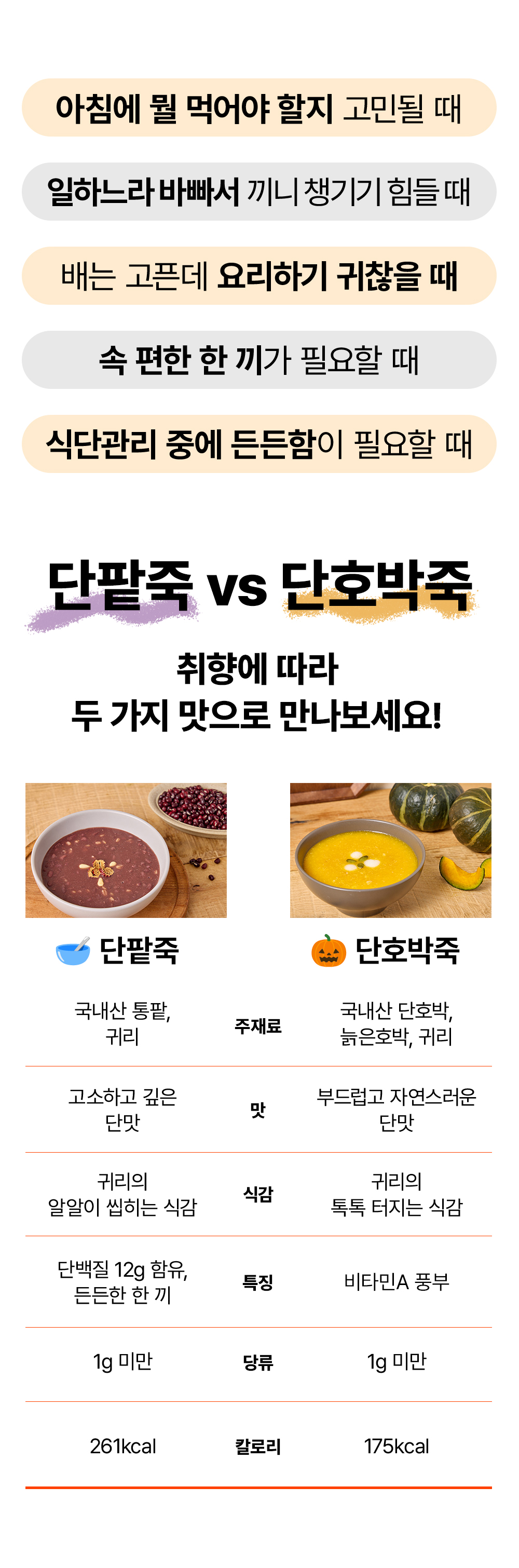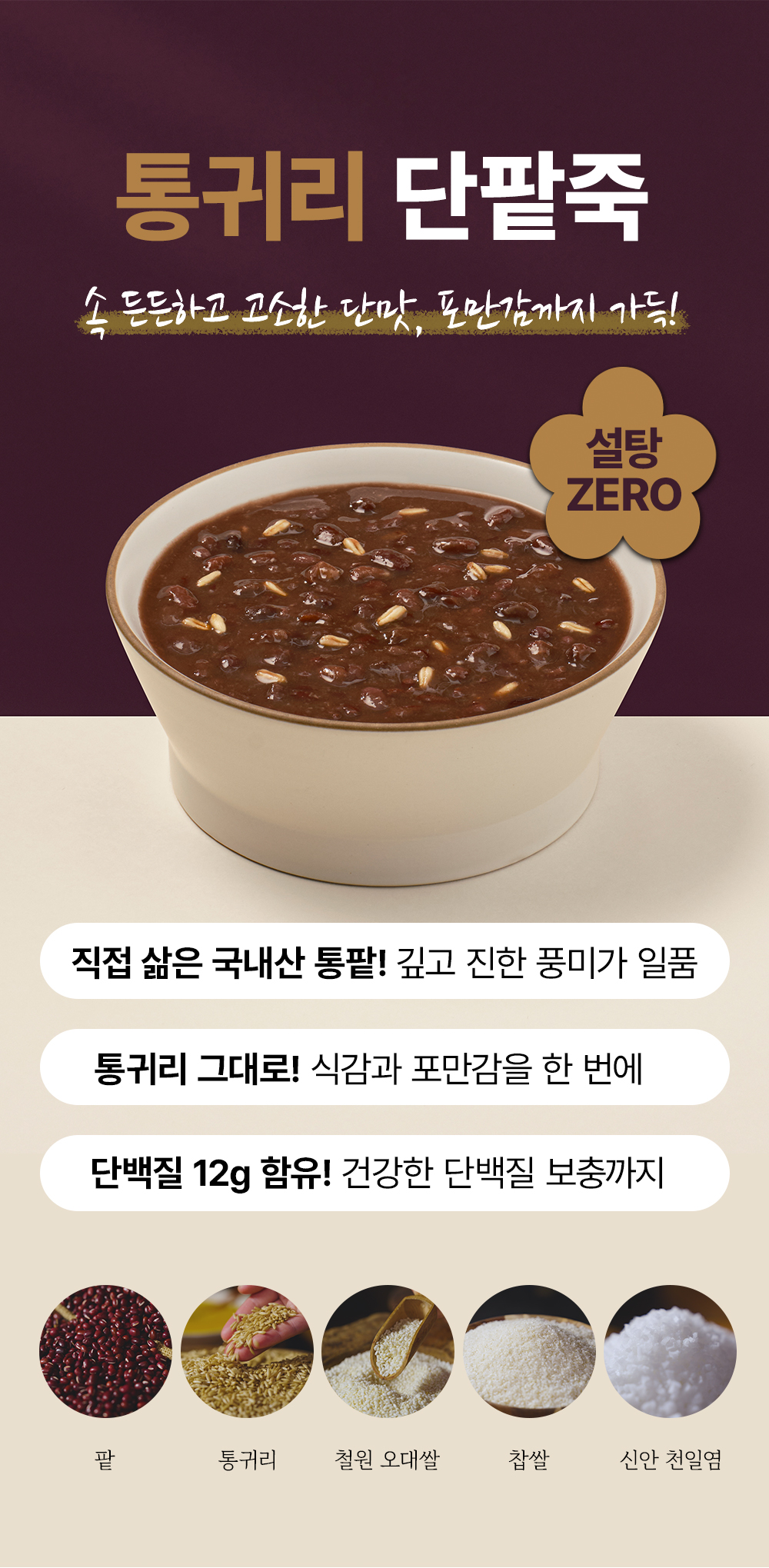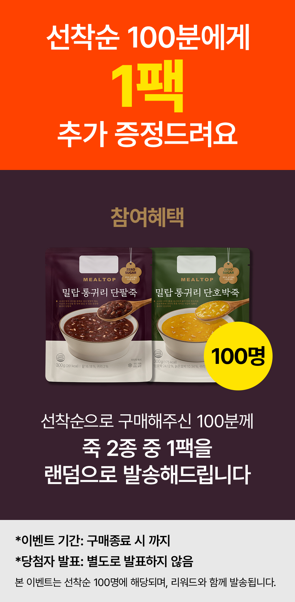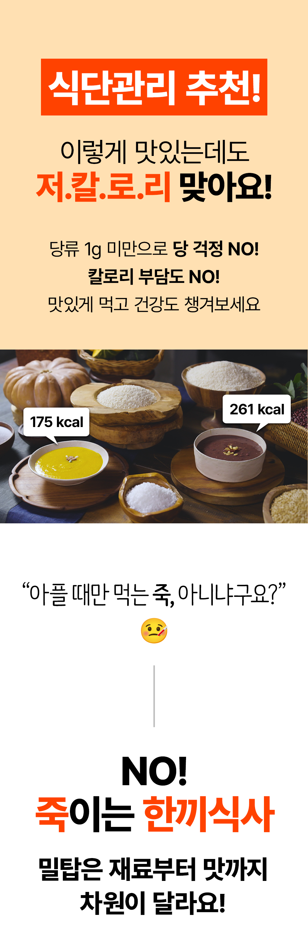 1. 🍲 통귀리 단팥죽과 단호박죽 - 국내산 원재료 사용, 설탕 제로 건강 죽 제품 2. ⏱️ 전자레인지 3분 조리 - 간편하고 빠른 조리로 바쁜 일상에 적합 3. 🎁 선착순 추가 증정 이벤트 - 구매 시 단팥죽 또는 단호박죽 1팩 추가 증정