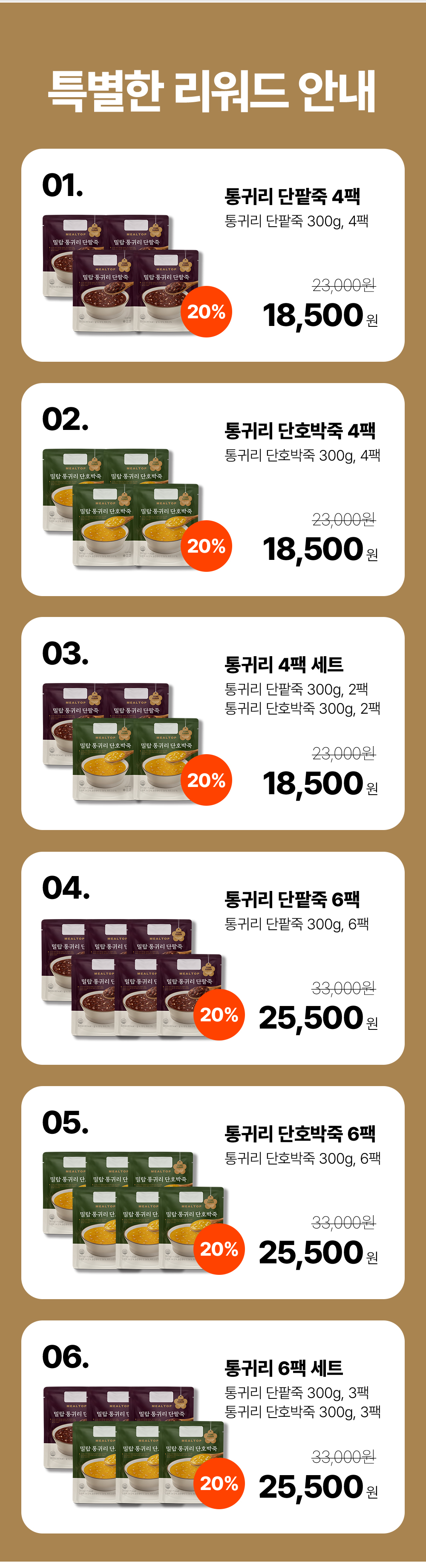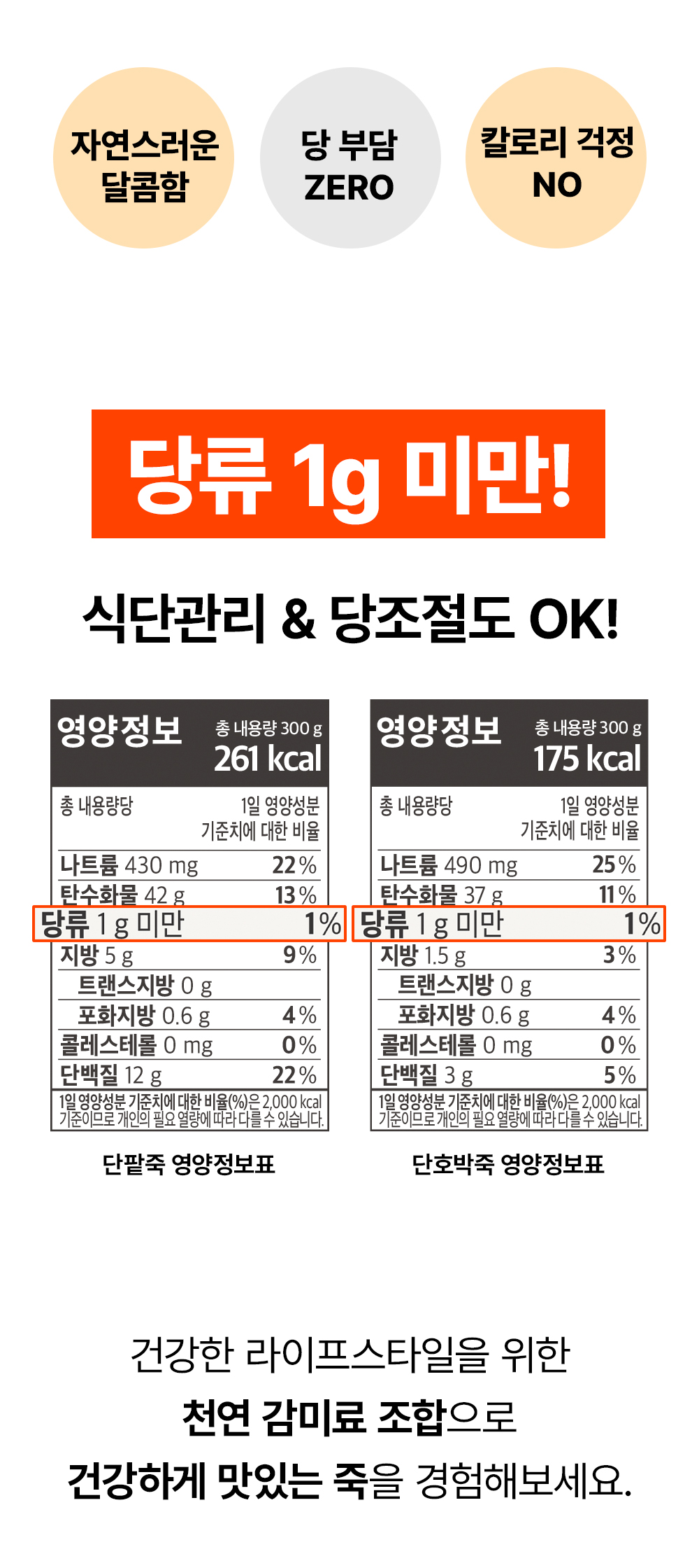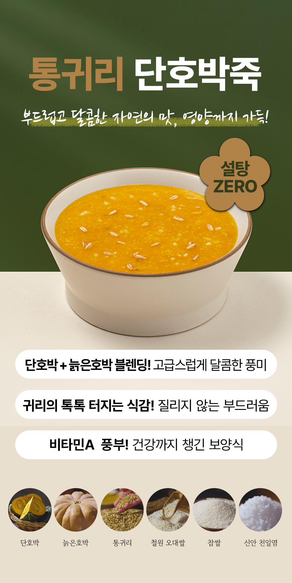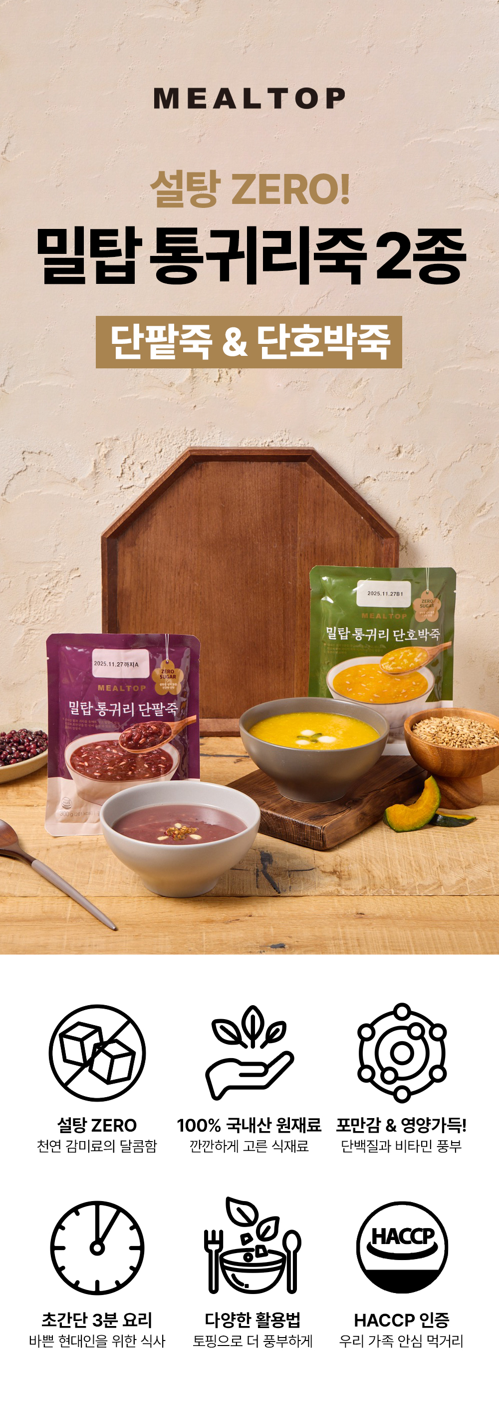 1. 🍲 통귀리 단팥죽과 단호박죽 - 국내산 원재료 사용, 설탕 제로 건강 죽 제품 2. ⏱️ 전자레인지 3분 조리 - 간편하고 빠른 조리로 바쁜 일상에 적합 3. 🎁 선착순 추가 증정 이벤트 - 구매 시 단팥죽 또는 단호박죽 1팩 추가 증정