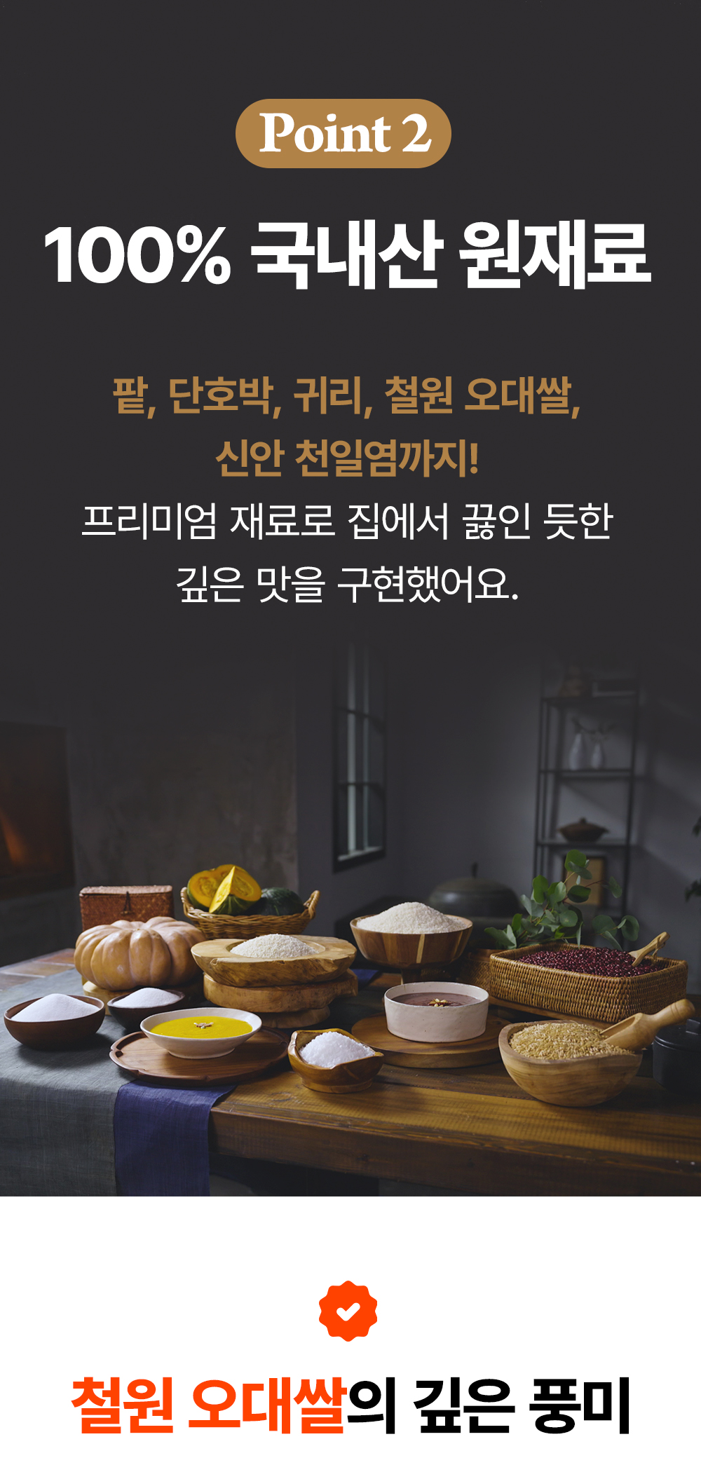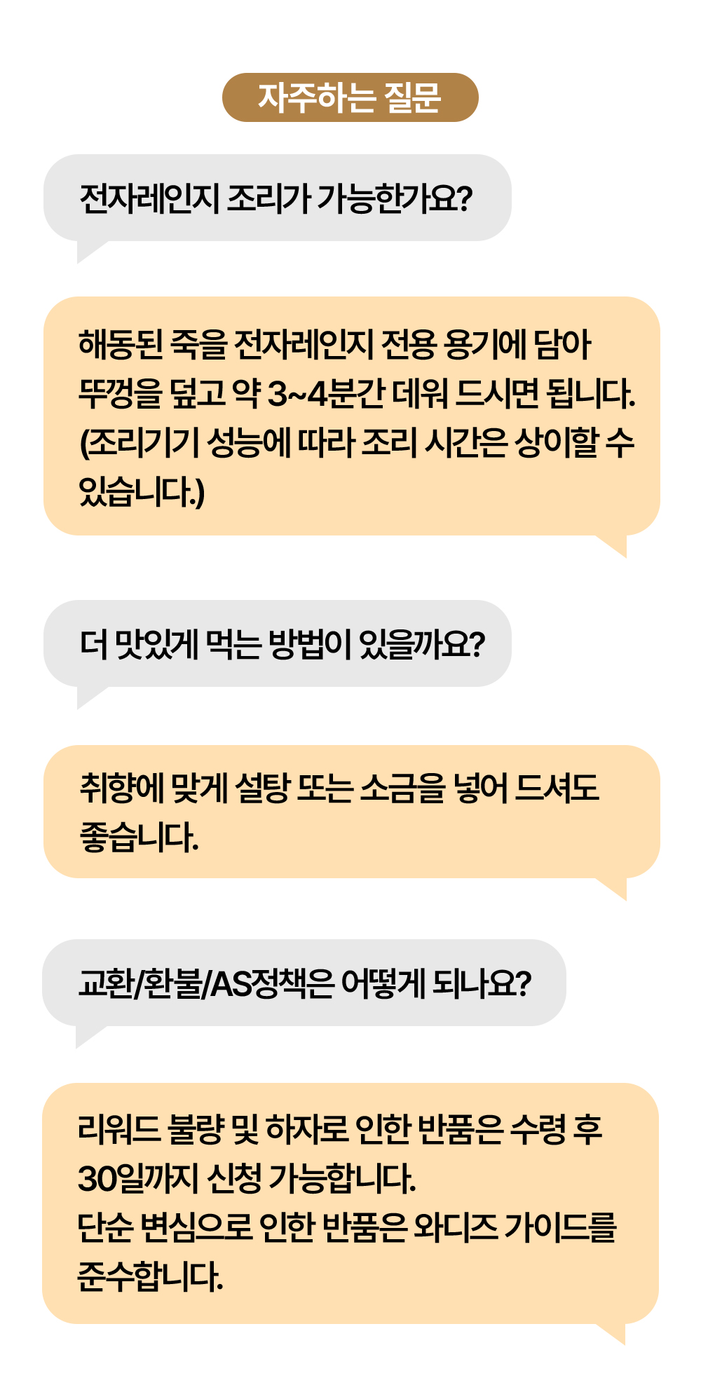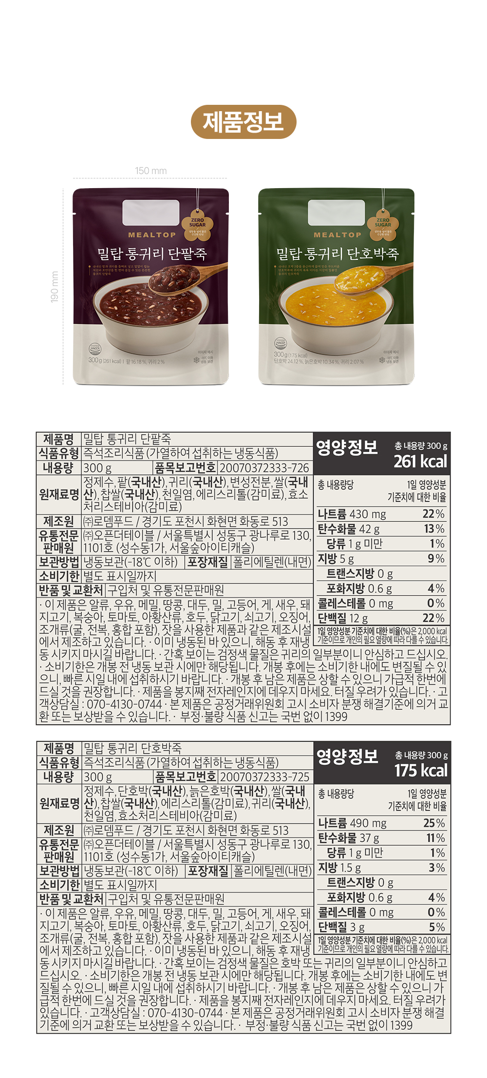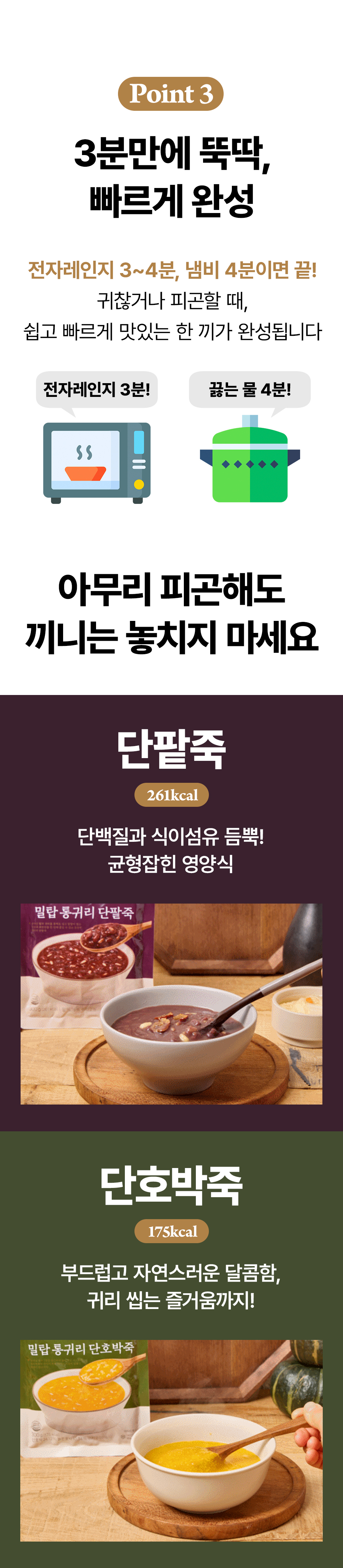 1. 🍲 통귀리 단팥죽과 단호박죽 - 국내산 원재료 사용, 설탕 제로 건강 죽 제품 2. ⏱️ 전자레인지 3분 조리 - 간편하고 빠른 조리로 바쁜 일상에 적합 3. 🎁 선착순 추가 증정 이벤트 - 구매 시 단팥죽 또는 단호박죽 1팩 추가 증정