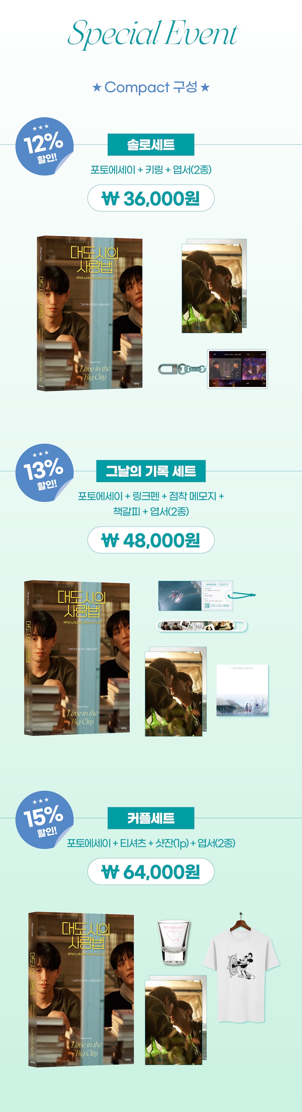 포토에세이 + 포토카드(5종) + 미니 포스터(2종) + 엽서(2종) + 스티커 세트 + 인생 네컷(3종) + 책갈피