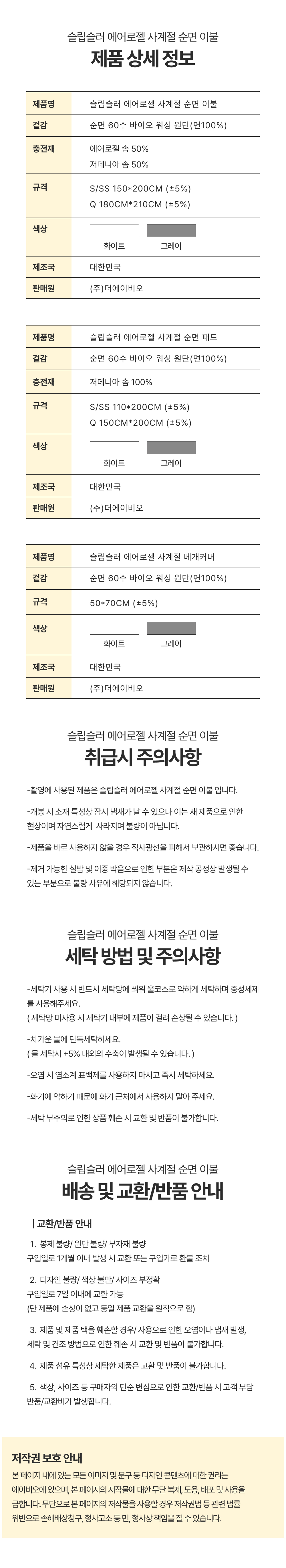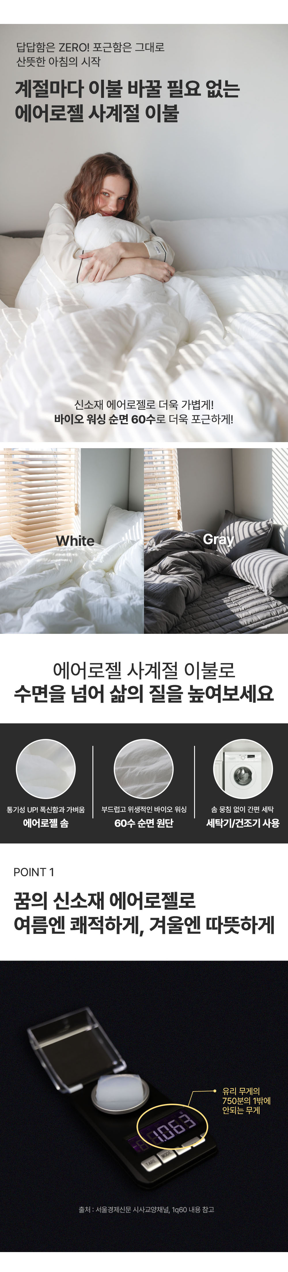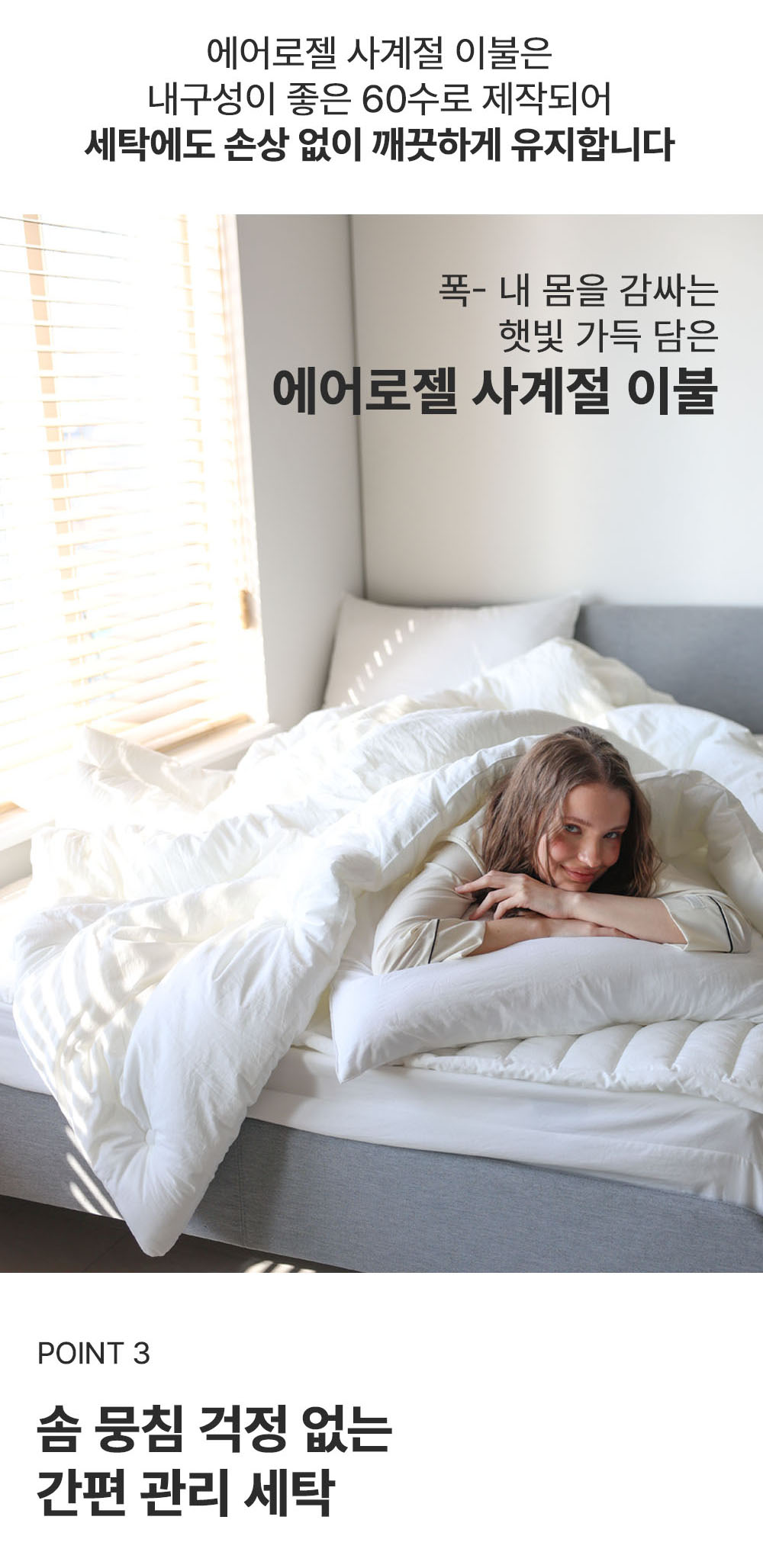 1. 🛏️ 에어로젤 사계절 순면 이불 - 공기 99% 신소재로 가볍고 쾌적한 사계절 이불 2. 🌿 100% 순면 60수 바이오 워싱 원단 - 부드럽고 피부 자극 없는 위생적 소재 사용 3. 🎁 최대 49% 할인 및 무료 증정 혜택 - 다양한 세트 구성과 한정 수량 할인 이벤트 제공